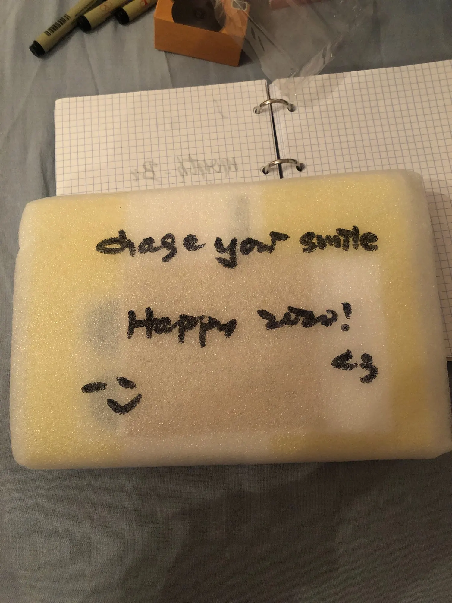 Блокнот чудесный, упакован очень хорошо, на упаковочном материале послание покупателю, очень мило) от руки маркером, сам блокнот приятный на ощуп, цвет как на картинке, листы очень плотные, пронумерованы, немного помяты углы на обложке, но не критично, есть 2 закладочки, внутри подарочки, наклейки, 2 открытки и послание❤