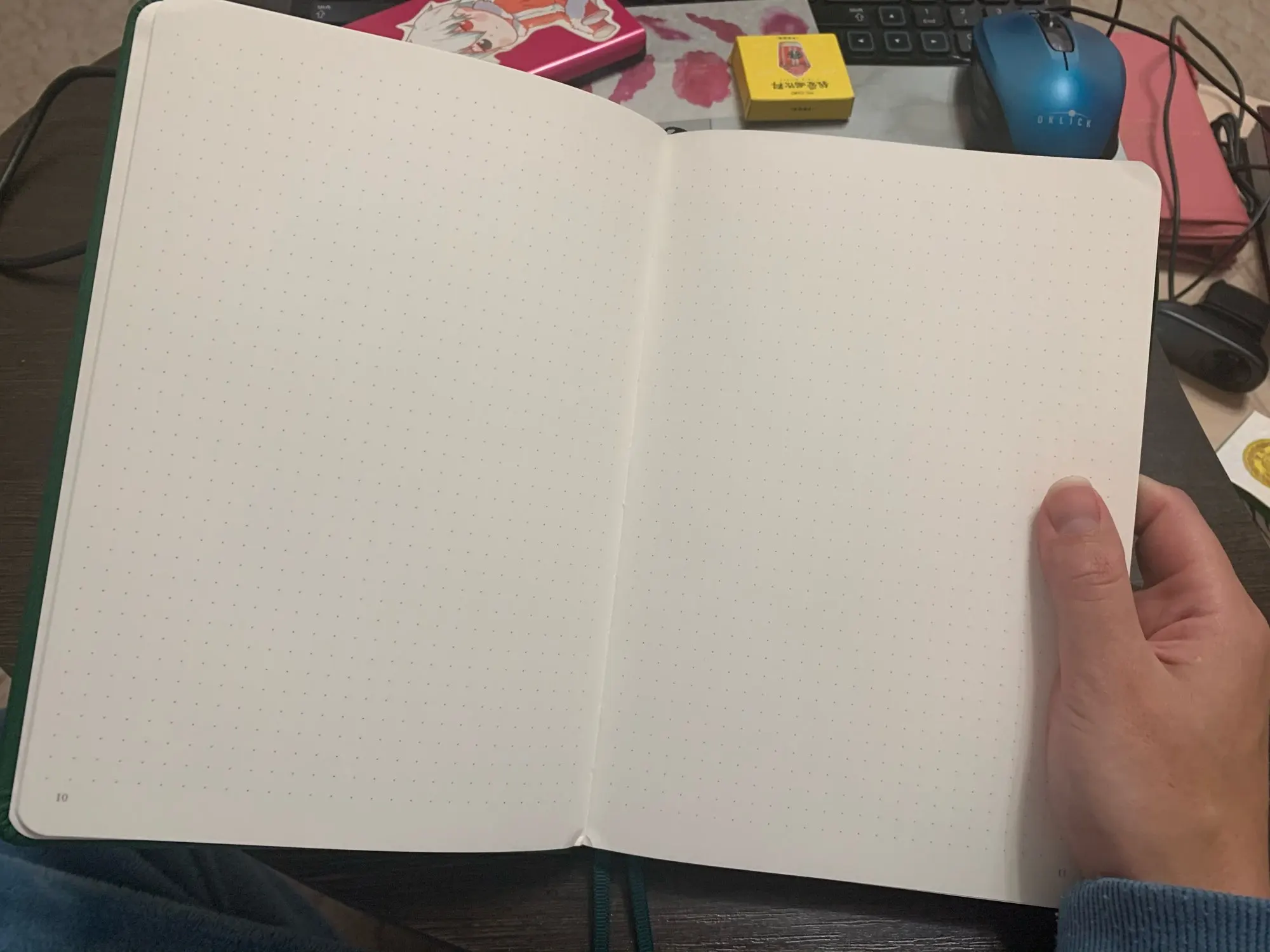 Продавец отправил товар сразу, посылка дошла очень быстро, бууввльно за 2 недели. В подарок положили очегь милые стикеры. Бумага плотная, точечки внутри светло-серые, абсолютно не мешают. Блокнотами очень довольна.
