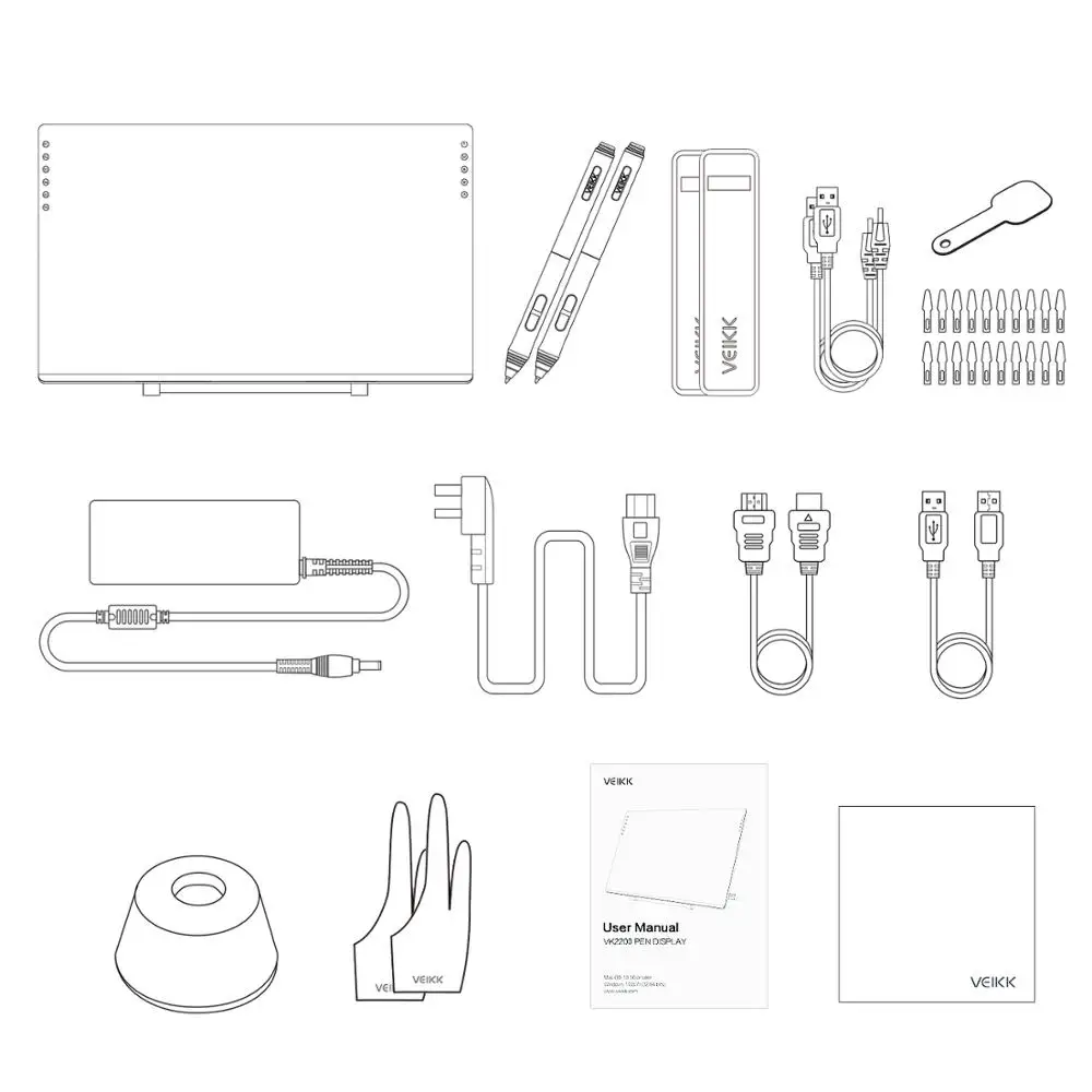 1. Советы по подключению:Для подключения на вашем компьютере должны быть доступны порты HDMI и USB, если нет, вам нужен адаптер для преобразования соединения. Убедитесь, что вы полностью подключили компьютер и дисплей VK2200 к usb-кабелю и HDMI-кабелю.2. Установка драйвера:Драйвер VEIKK будет регулярно обновляться, поэтому перейдите на официальный веб-сайт VEIKK, чтобы загрузить новейший драйвер и установить его на свой компьютер.Удалите все планшет/драйвер дисплея и закройте все программы рисования и антивирусные программы перед установкой драйвера VEIKK, а затем перезагрузите компьютер.Если ваша операционная система является Mojave10.14 или более поздней, пожалуйста, добавьте «Центр драйверов планшета» в белый список, сначала после установки драйвера на вашем компьютере.VEIKK предоставляет онлайн-техническое обслуживание на нашем официальном сайте, чтобы помочь вам.Спецификация:Активная область: 21,5 ДюймовДавление ручки: 8192 уровнейDPI: 1920x1080Разрешение: 5080 LPIСкорость отчета: 250 PPSЦветовая гамма:99% sRGBКонтрастность: 1000:1Высота чтения: 15 ммПосылка включает в себя:1 x ручка дисплей2 перезаряжаемых ручки + 2 кармана для ручек1 держатель ручки (включая 8 наконечников)20x Сменные ручки для перьев + 1 ручка для удаления перьев (в одном пакете)2 х перчатки художника + 1 х Салфетка для чистки1 кабель питания + 1 адаптер питания1 кабель HDMI + 1 usb-кабель1 x Кабель DP-HDMI1 x Руководство по эксплуатации