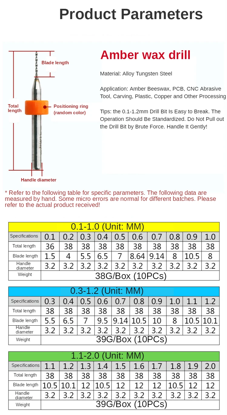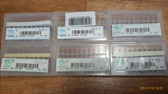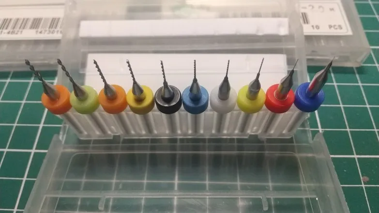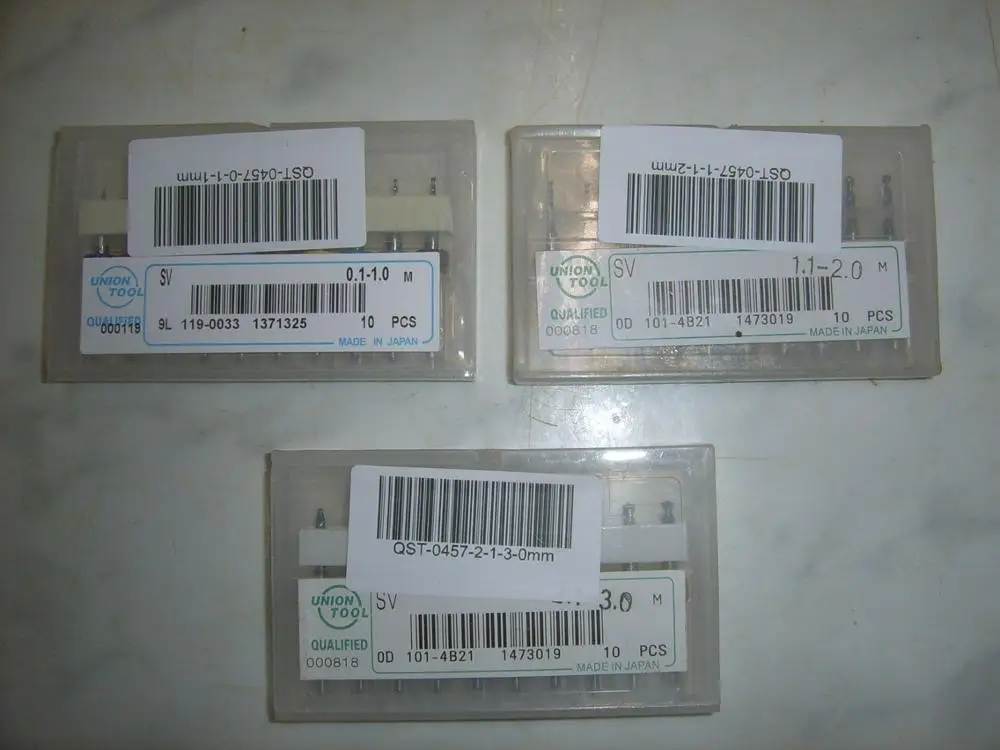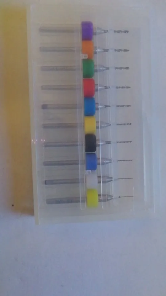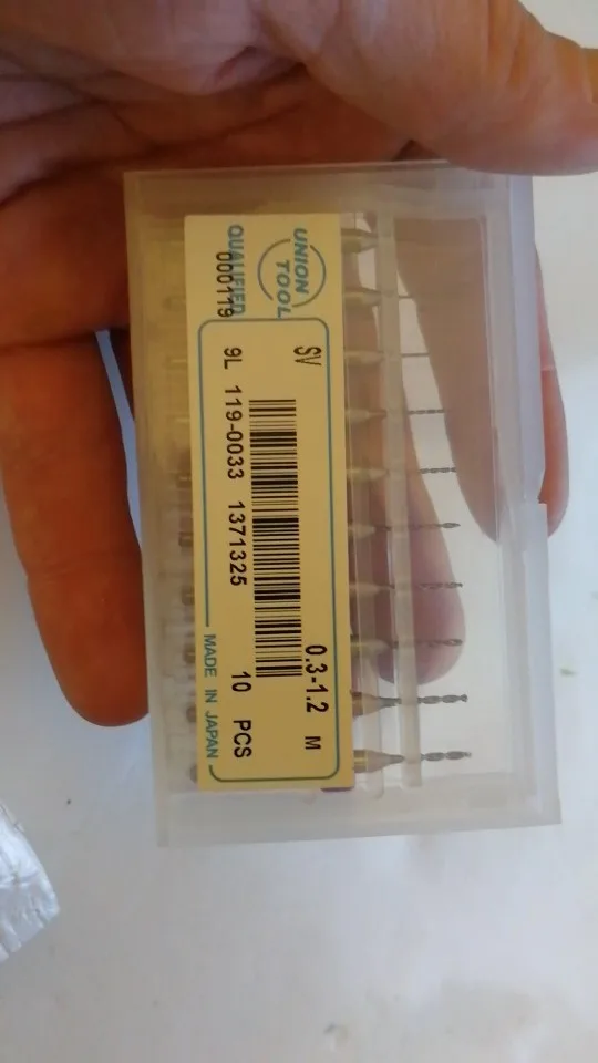 Набор приобретался для сверления фольгированного текстолита. Для этого нужен станок с минимальными биениями патрона, иначе сверла сломаются. Коробка со сверлами испачкана в какой-то липкой субстанции. Надписи на хвостовиках выполнены разными шрифтами и некоторые читаются с трудом. Но мне это не важно. Диаметр хвостовиков 3,2 мм. Заказал 12 февраля, получил 6 марта (Оренбургская область).