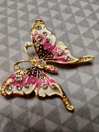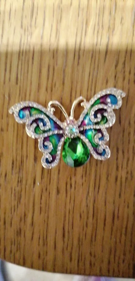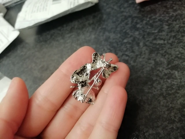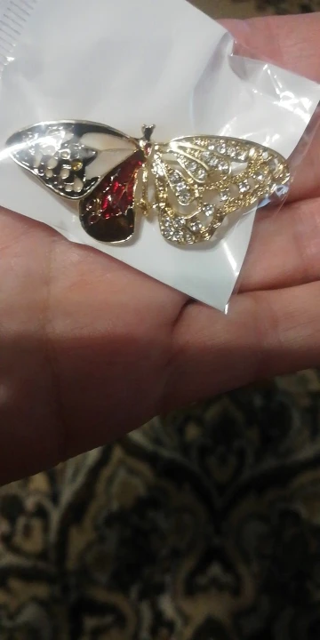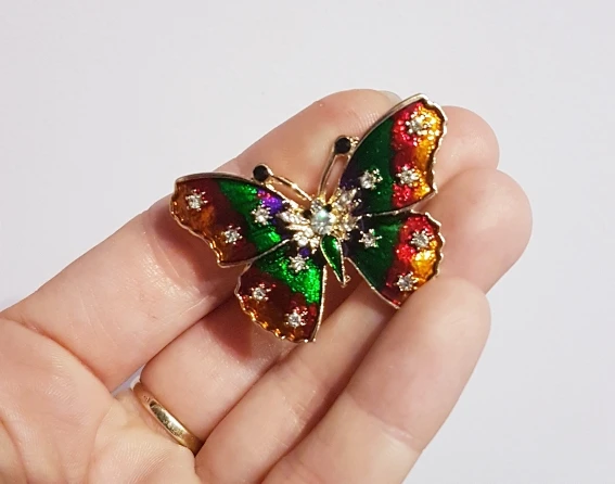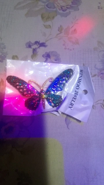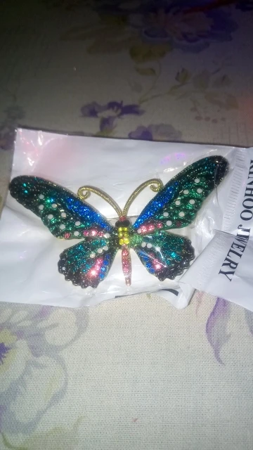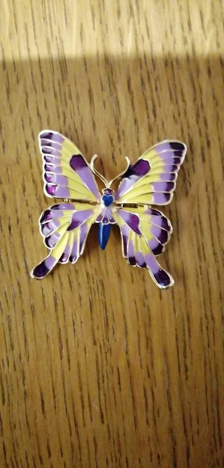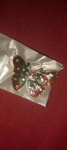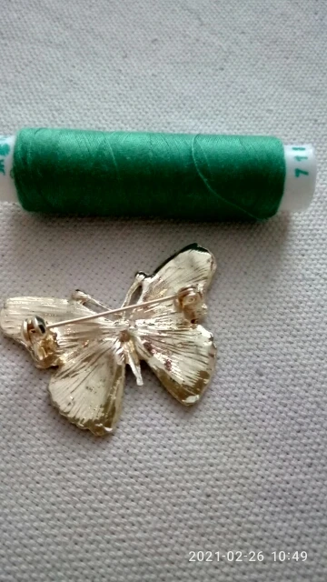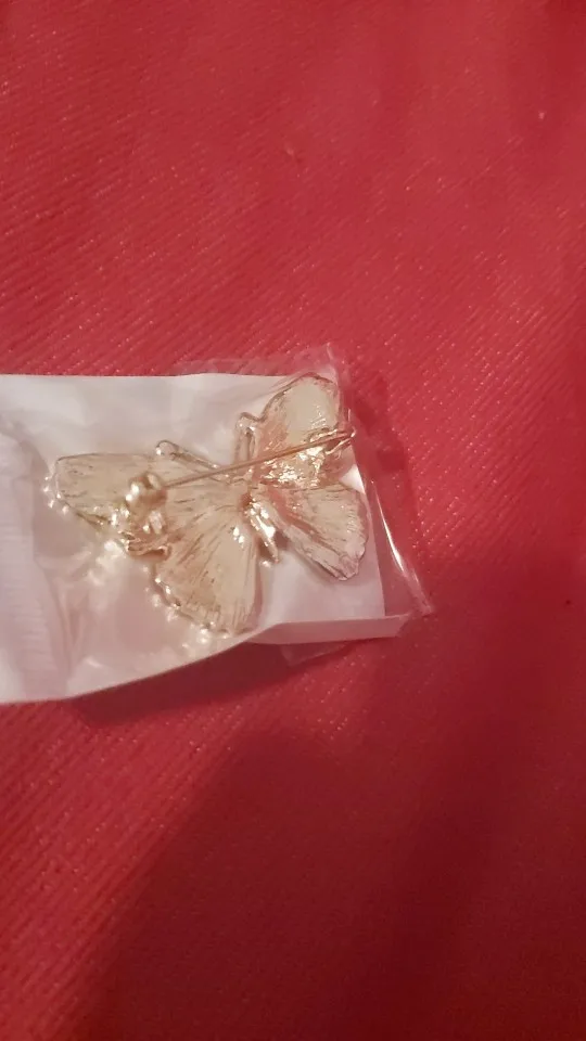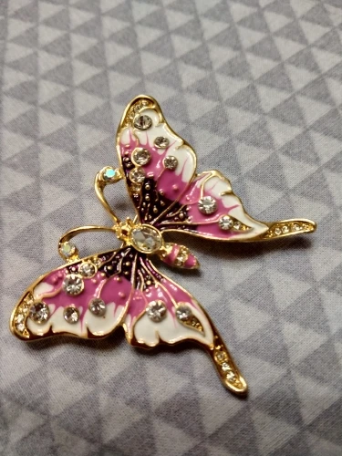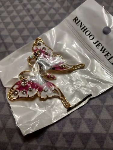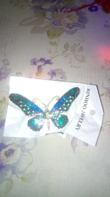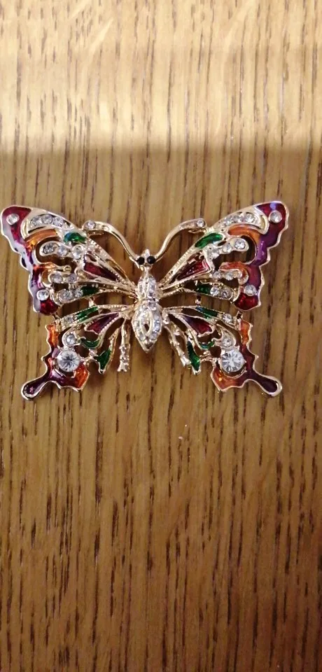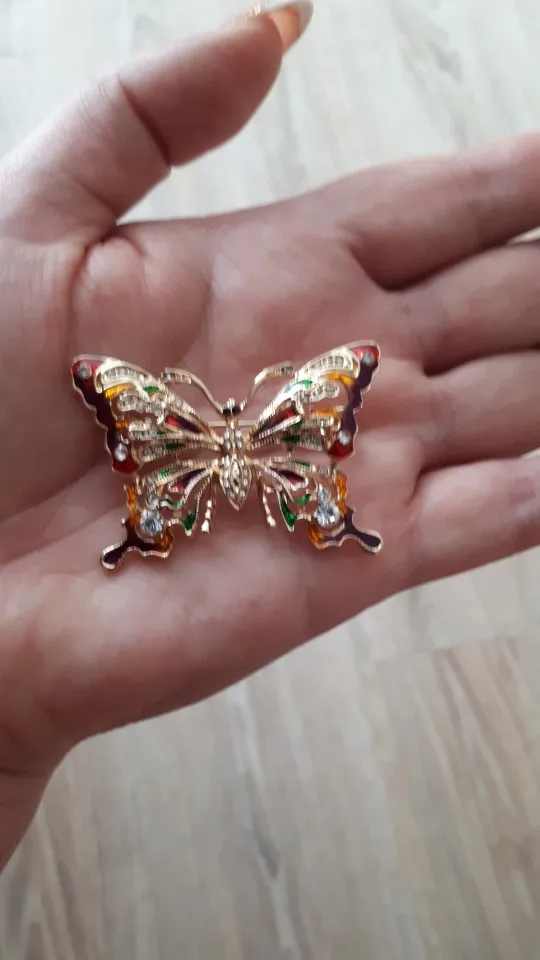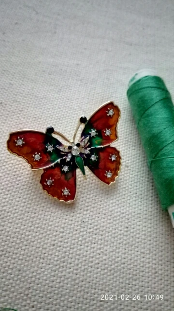 Бабочка шла в соединённой посылке почти месяц, брошка просто шикарная, эмаль нанесена отлично, камешки переливаются, а вот застёжка у меня попалась бракованная, очень хлипкая, не держится, расстёгивается, пришлось зажимать пласкогупсами, но за такую красоту звёзды снимать не стала , уж очень красивая бабочка . брала за 116,86р.