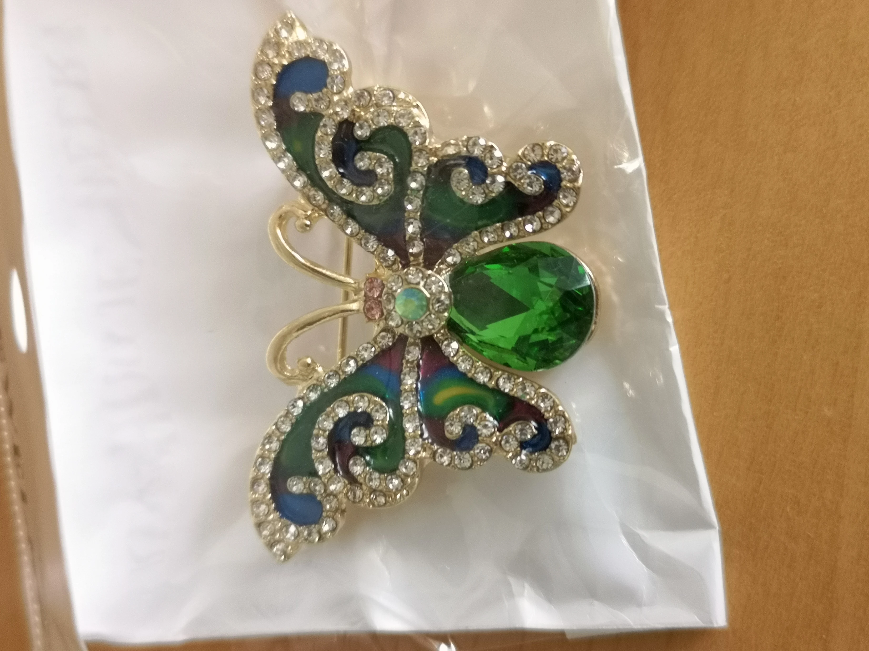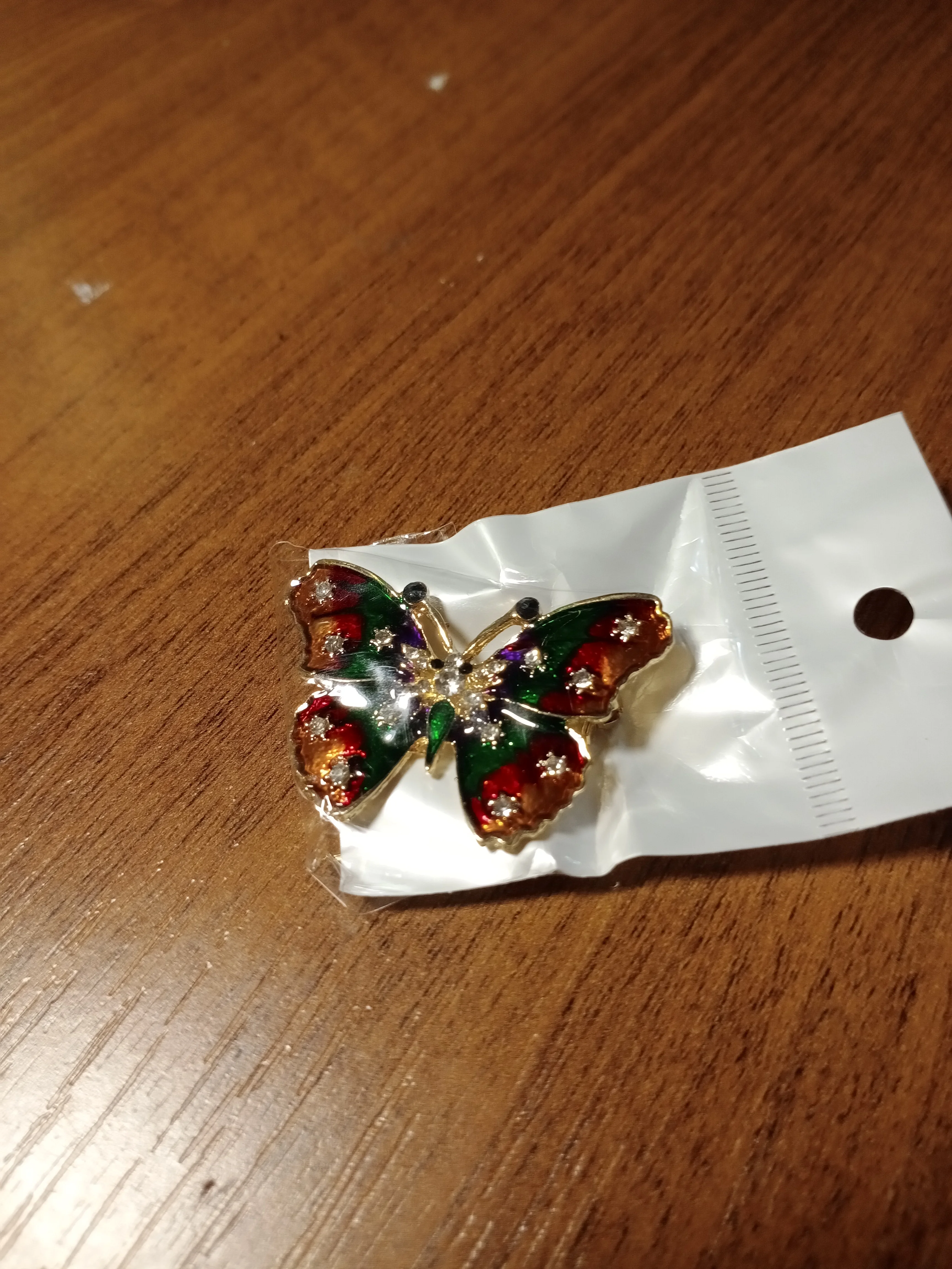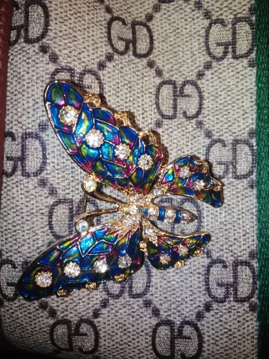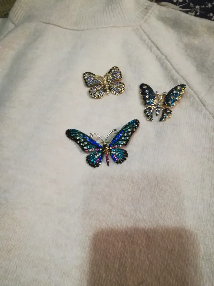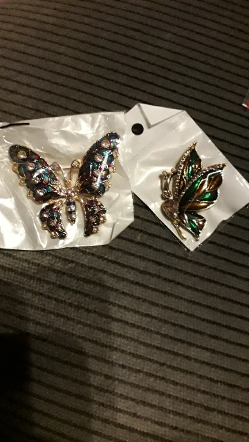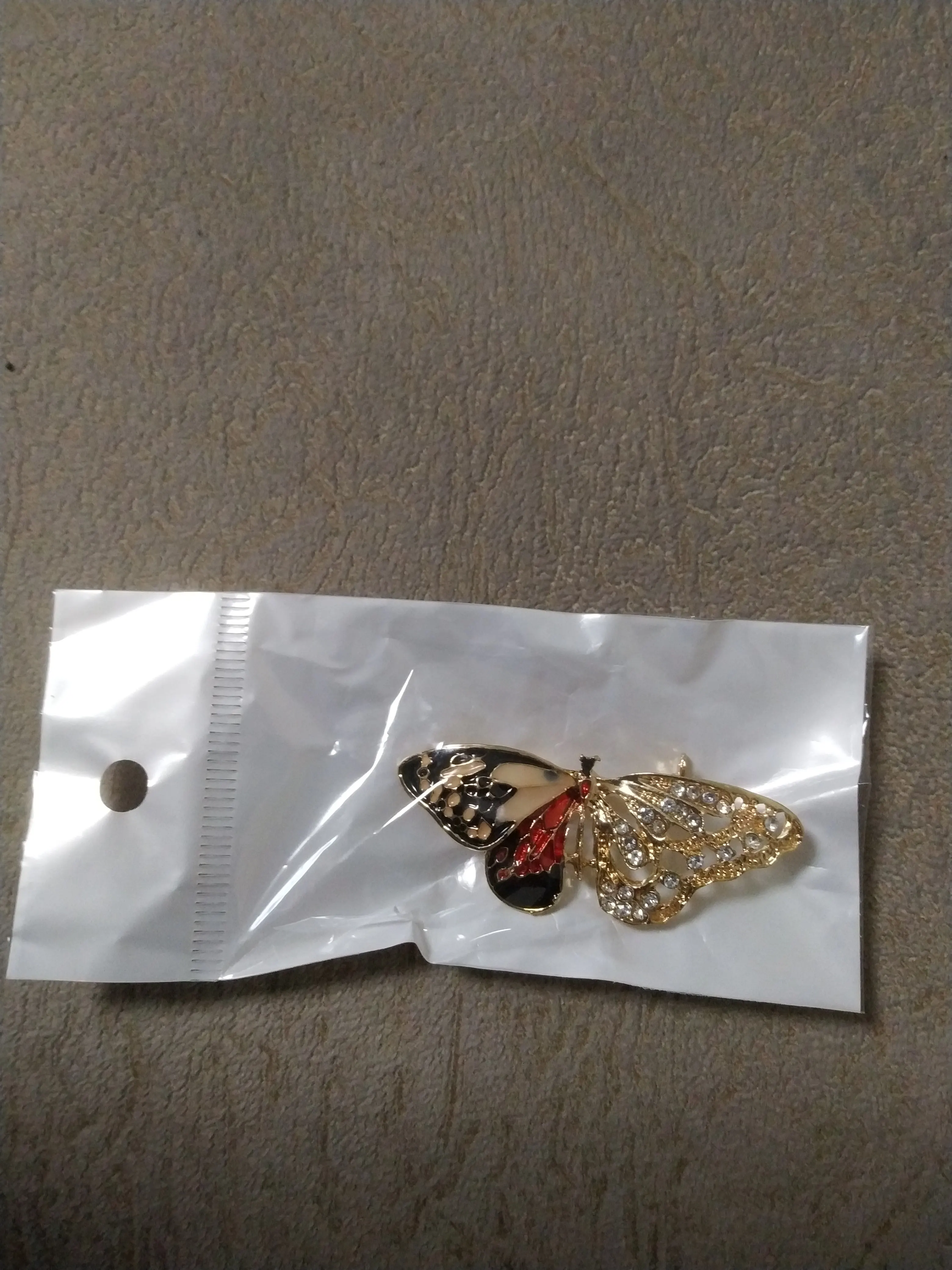 Бабочка шла в соединённой посылке почти месяц, брошка просто шикарная, эмаль нанесена отлично, камешки переливаются, а вот застёжка у меня попалась бракованная, очень хлипкая, не держится, расстёгивается, пришлось зажимать пласкогупсами, но за такую красоту звёзды снимать не стала , уж очень красивая бабочка . брала за 116,86р.