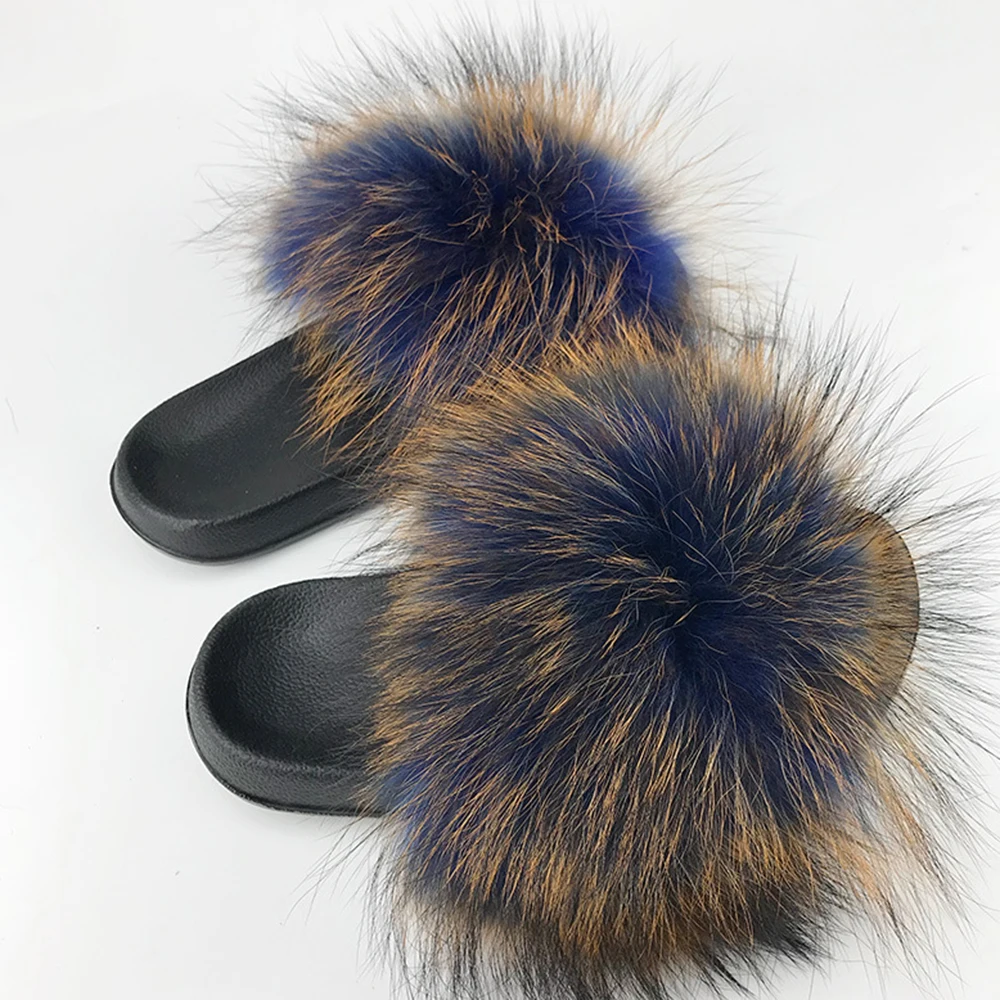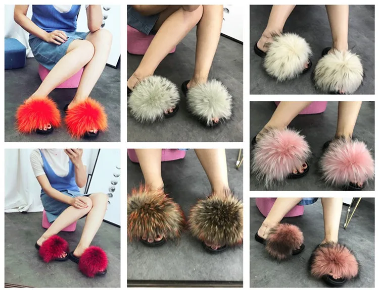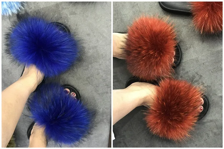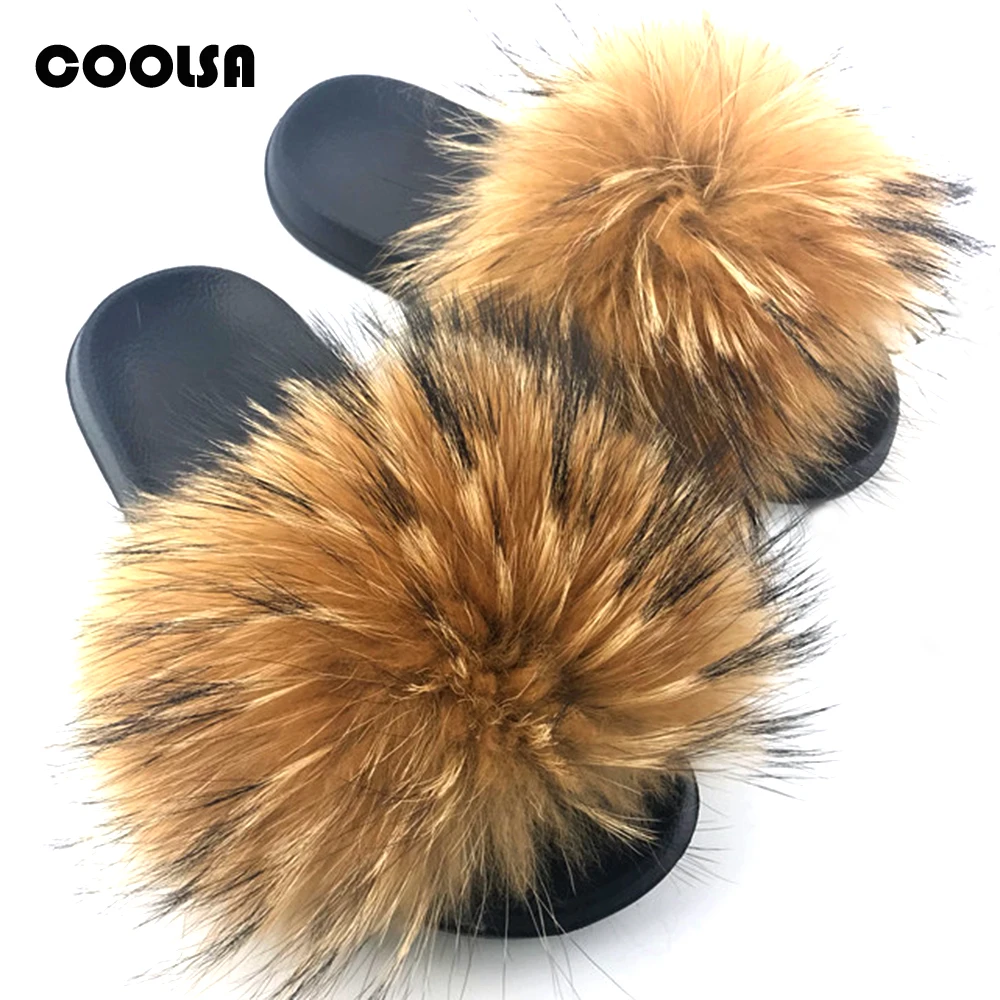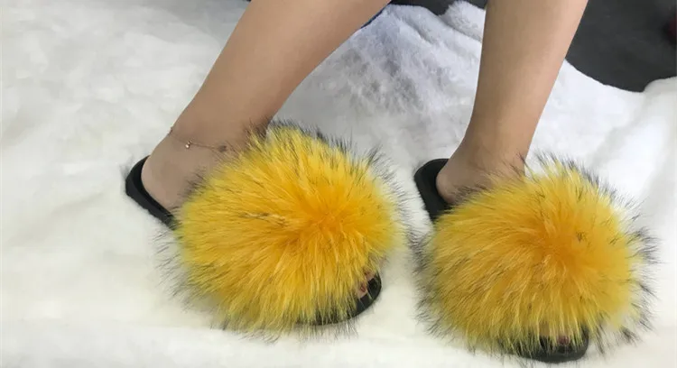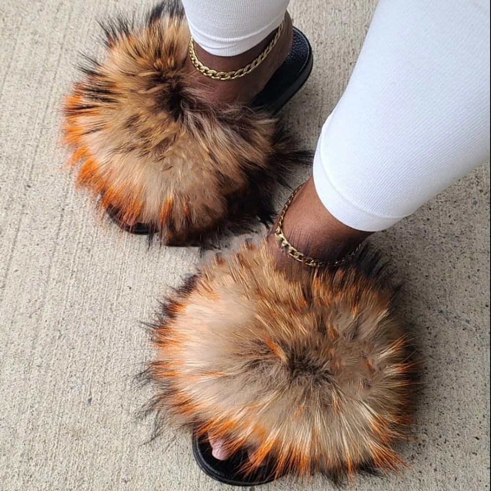 Шлепанцы женские с мехом енота, сланцы, натуральный Лисий мех, меховые шлепанцы, плоская подошва, Повседневные Плюшевые тапки, летняя обувь