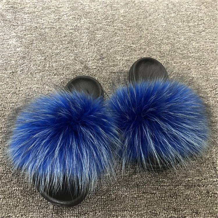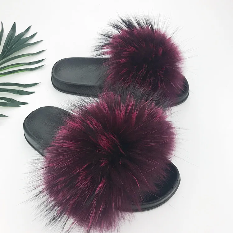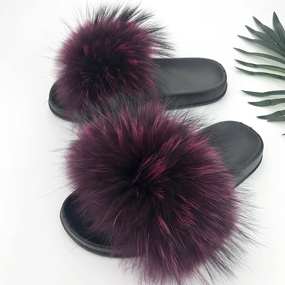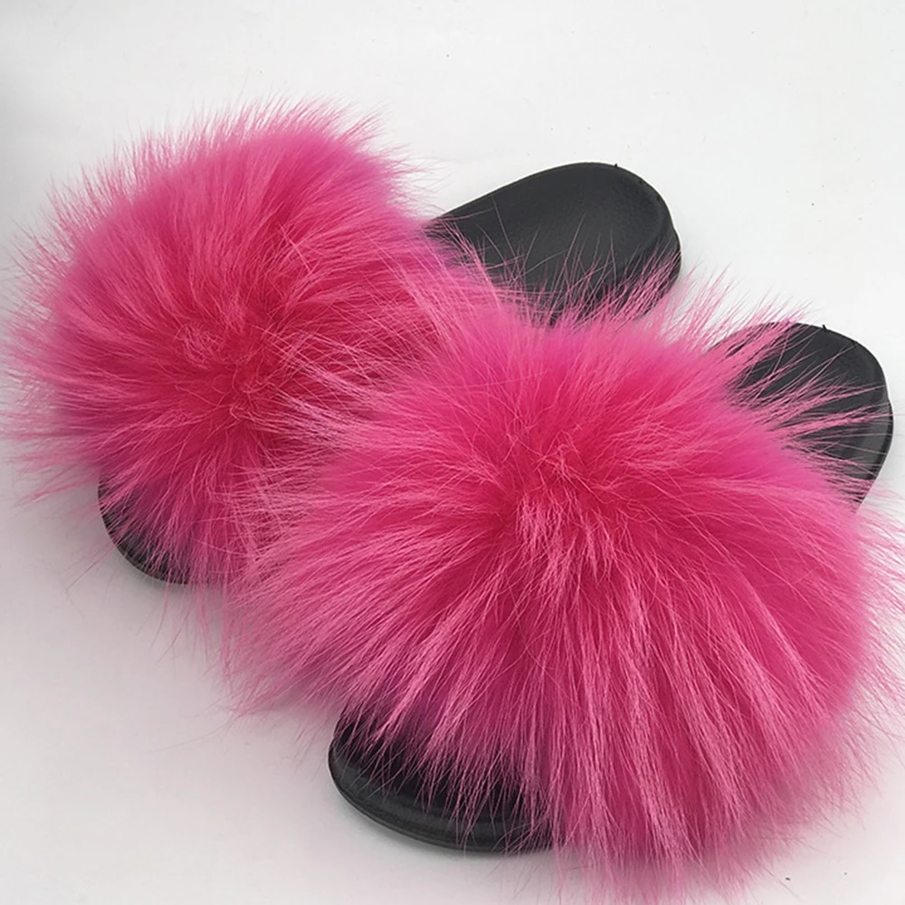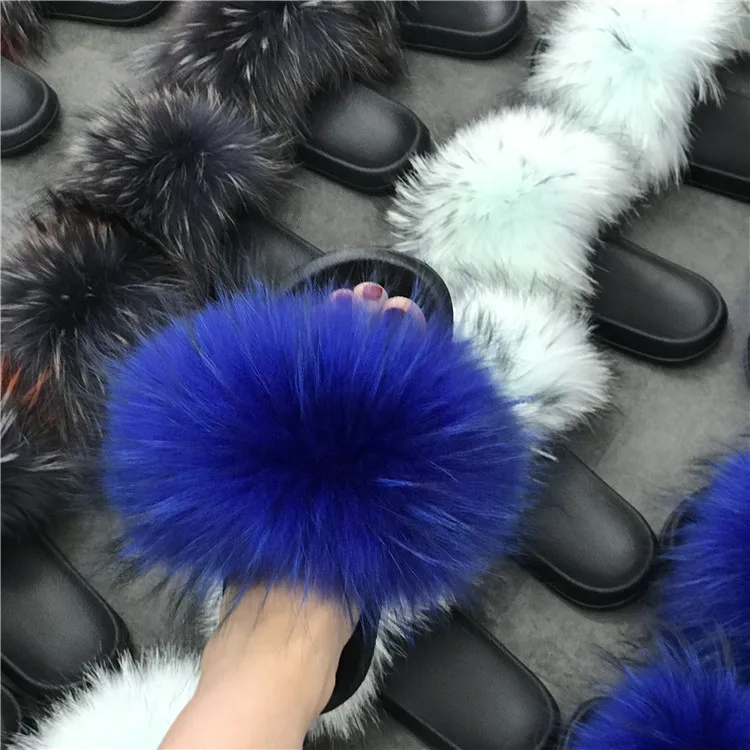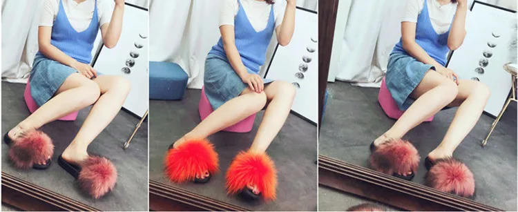 Шлепанцы женские с мехом енота, сланцы, натуральный Лисий мех, меховые шлепанцы, плоская подошва, Повседневные Плюшевые тапки, летняя обувь