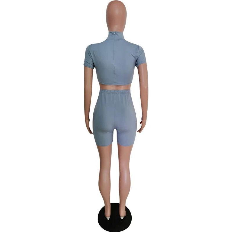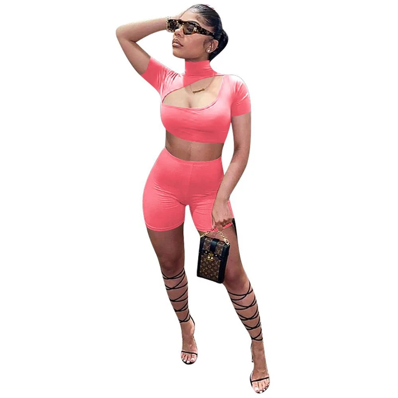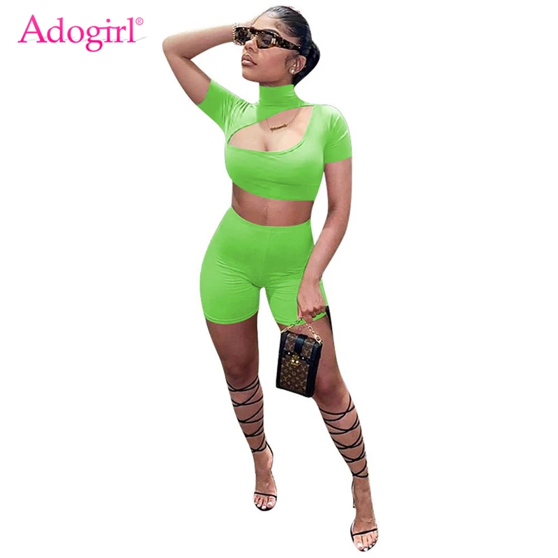 Adogirl 2020 летний Однотонный женский комплект из 2 предметов, спортивный костюм с воротником-стойкой, футболка с короткими рукавами и вырезами, короткий топ и шорты, костюм для фитнеса