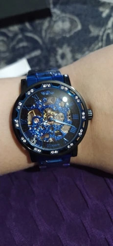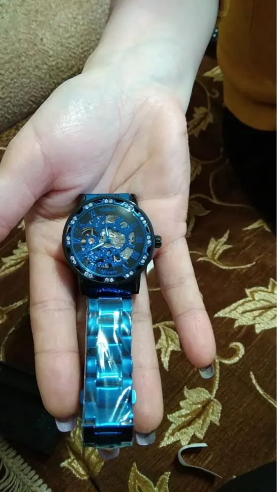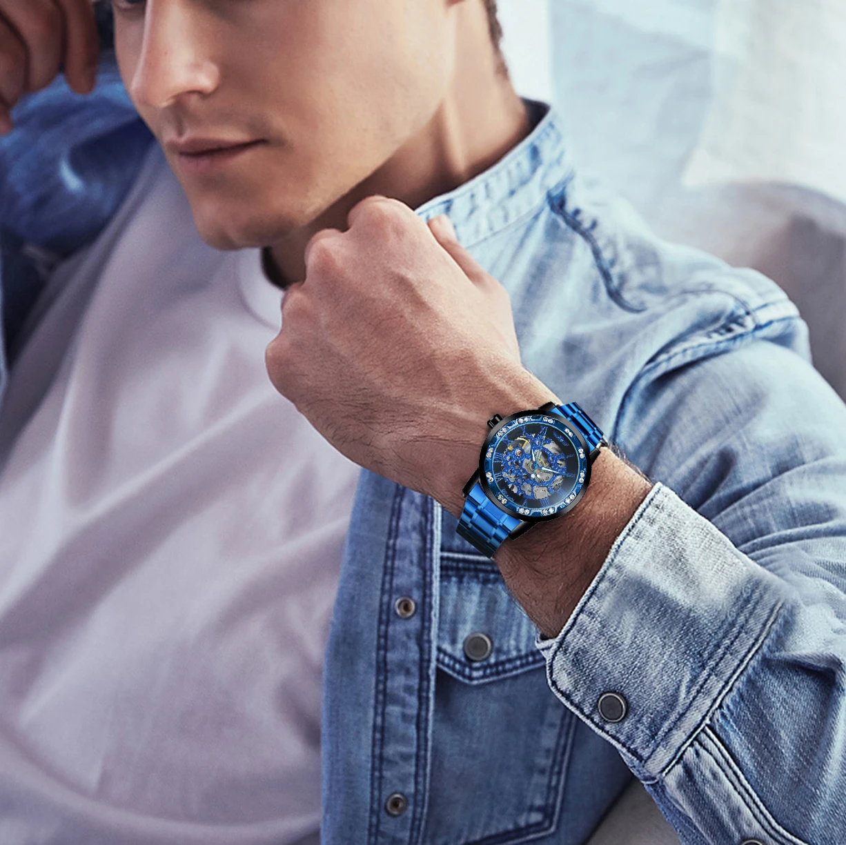 Механические часы Winner с прозрачными бриллиантами, мужские часы-скелетоны из нержавеющей стали синего цвета