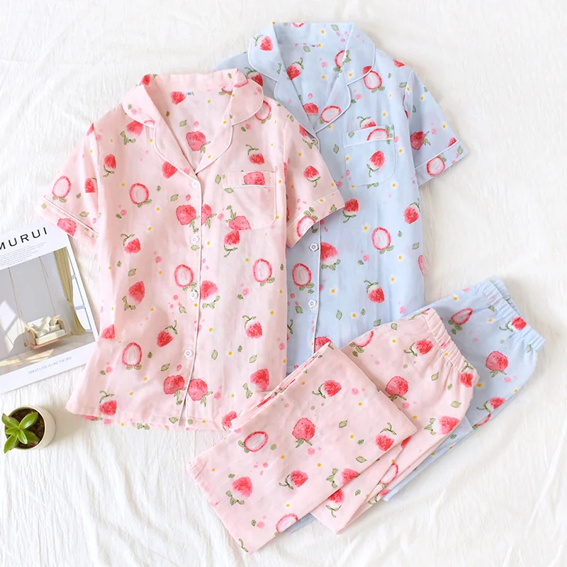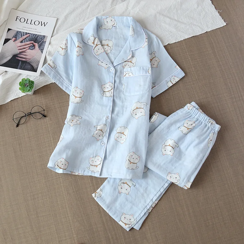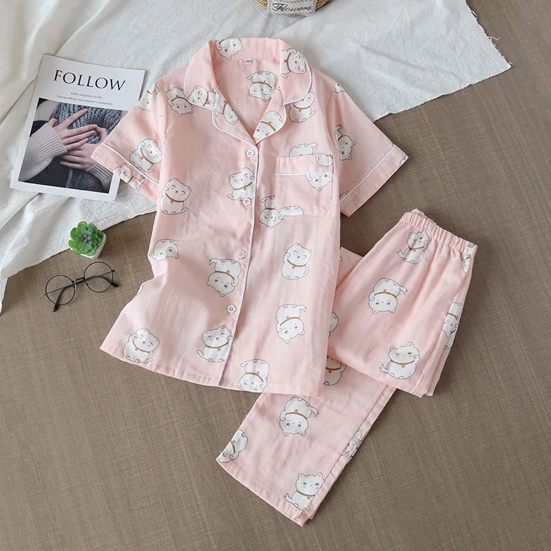 Пижама женская, 100% хлопок, с коротким рукавом, в японском стиле, 2021, домашняя, Симпатичные пижамные комплекты