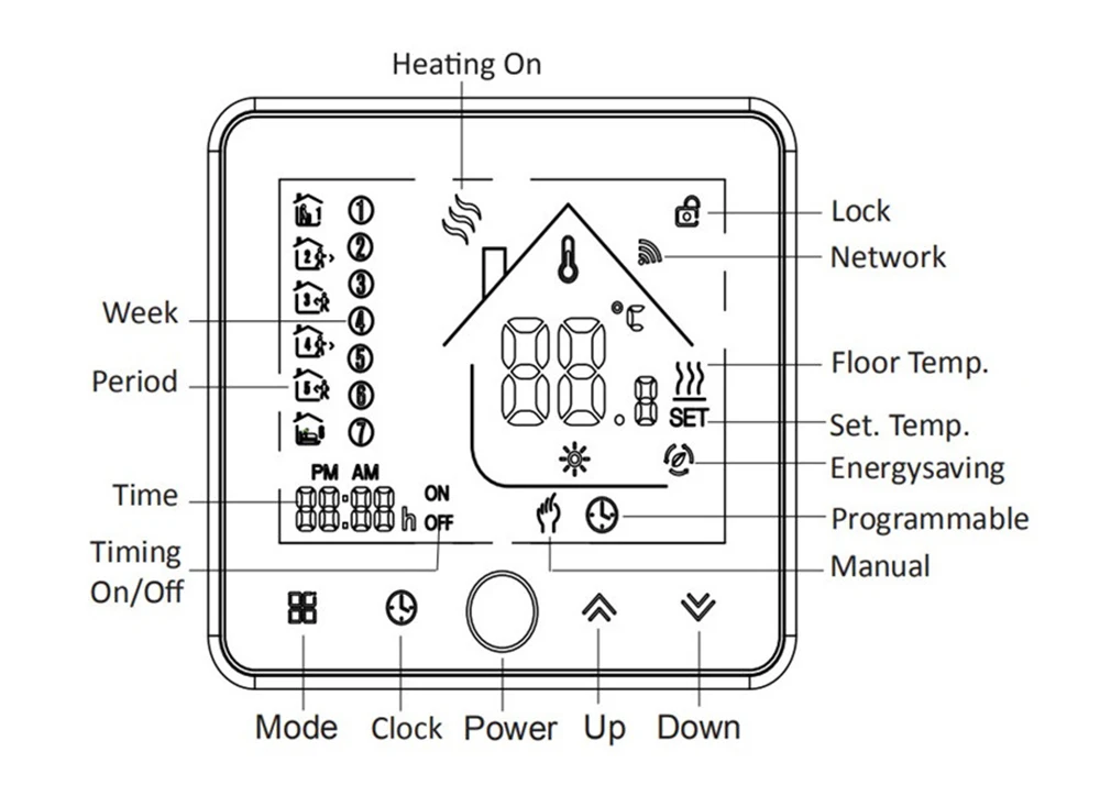 1. Функция памятиЗапомните все настройки после внезапного отключения питания. Когда питание включено снова, вам не нужно сбросить его.2. Программируемая функцияПоддержка 5 + 2 дней еженедельно программируется, шесть циклов программируемого контроля температуры.3. Элегантная хромированная рамка, сенсорная панель управления с перьями.4.5. 12/24 часовая система переключается.6 детских замков, чтобы избежать неправильной работы.7. Функция WifiТермостат wifi может управляться мобильным приложением, где бы вы ни находились.8. Поддержка голосового управления Alexa.