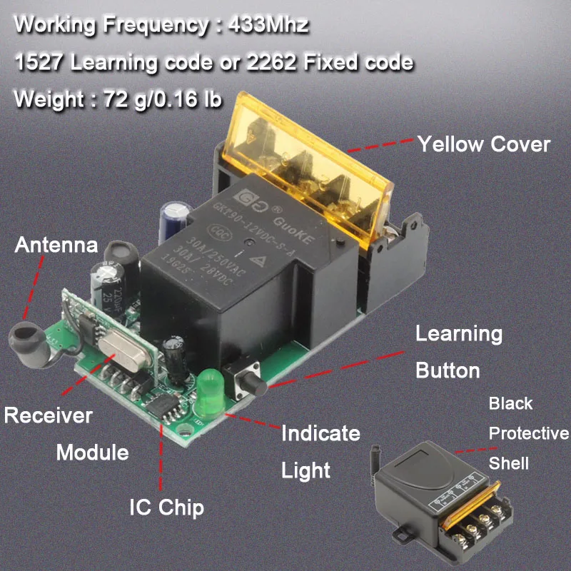 Технические данные приемника-Входная мощность: 75 в-250 В переменного тока-- Ток в режиме ожидания:<5 мА-Максимальный ток: 30 A-- Частота RF: 433 МГц-Рабочая температура:-30 ~ + 80-Режим работы RF: супергетеродинный-Чувствительность приема: >97dbm-- Дальность передачи: более 500 м (открытое пространство)-Удаленное Хранение: 25 шт.-Поддержка удаленного типа: код обучения 1527, фиксированный код-Режим работы: Мгновенный, тумблер, фиксация-- Размеры: 65*40*30 (мм)