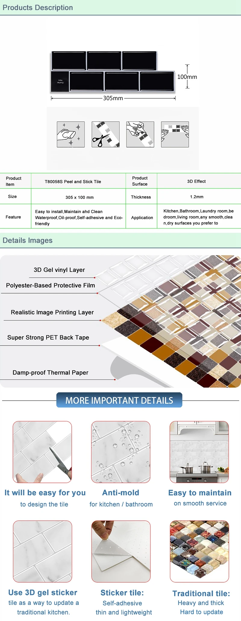 Плитка может быть легко установлена непосредственно над существующими панелями или гладкой поверхностью. Специально разработанная для кухни и ванной, плитка устойчива к нагреванию плиток и влажности ванных комнат.