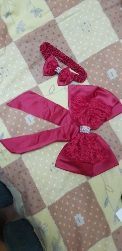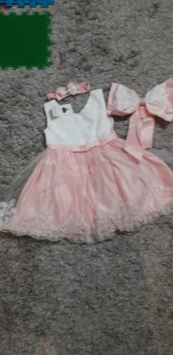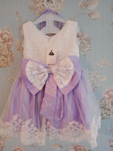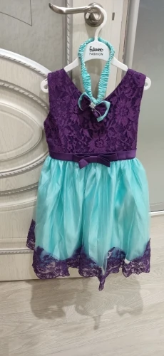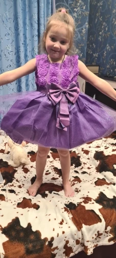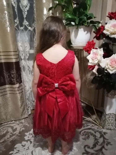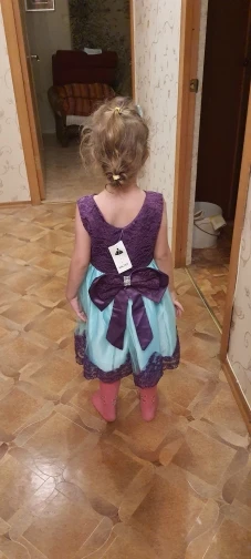 Хорошее платье, нарядное. На стройную девочку ростом 98см село как раз, больше не нужно. Подклад из хлопка только на верхней части платья, внизу синтетика. Повязку на голову дочь отказалась одевать, и бант оказался тяжеловат, выворачивается вниз. Можно наверное пришить кнопочки и зафиксировать, но дочка и бант забраковала, хотя платье ей очень понравилось.