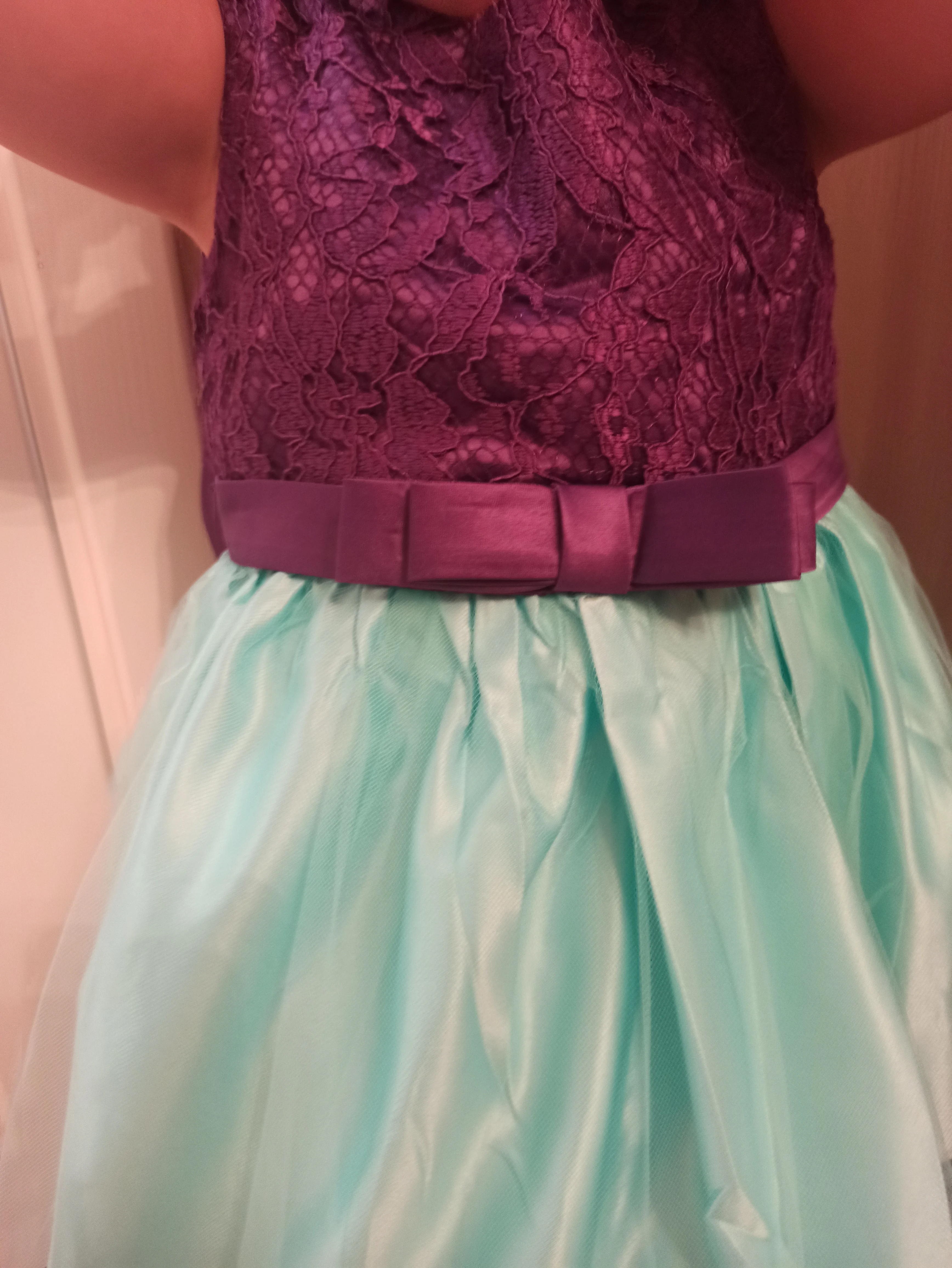 Платье хорошо пошито, внутри хлопковый поделал, снизу подъюбник из подкладочной ткани. Животик не колет, швы ровные. На рост 98 брала размер 4Т (110 см, как я поняла). Длина хорошая, а вот в ширине велико, подделывать будем