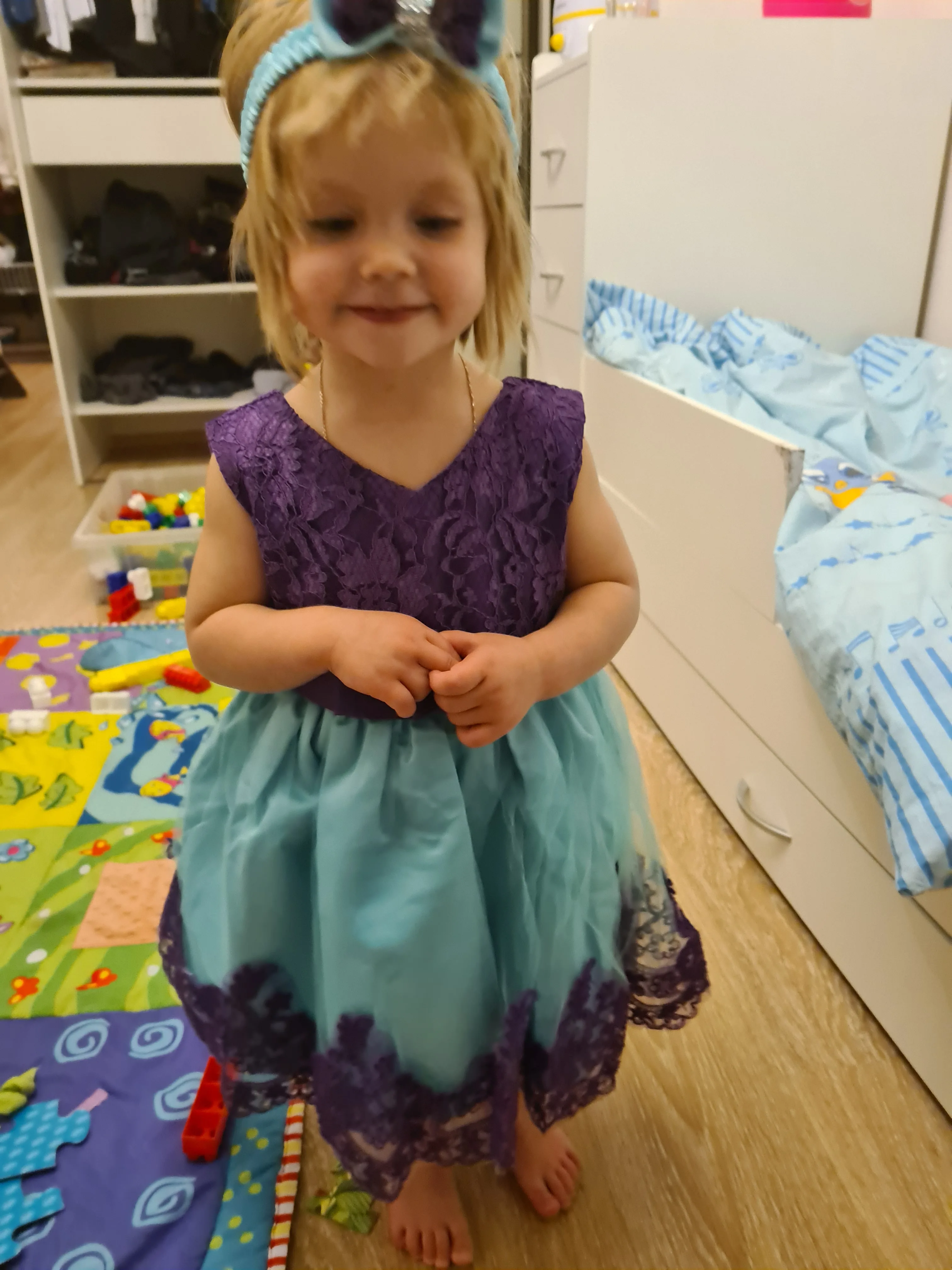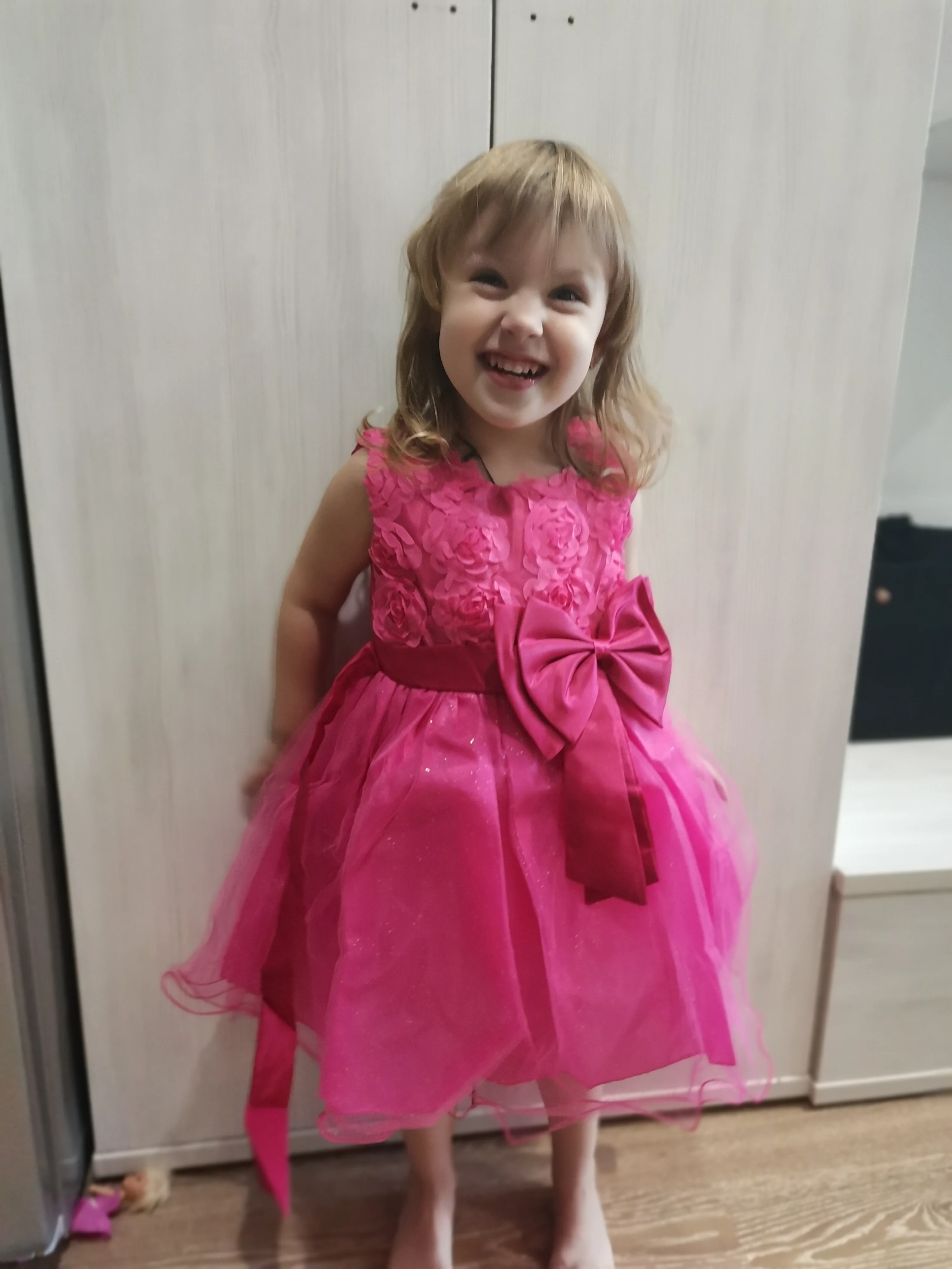 Платье обалденное. Идёт в размер. Дочке 2,5 года, рост 89, среднего телосложения, размер 90 очень хорошо подошёл, боялась, что мало будет. Несколько слоев юбок, но лёгкое при этом. Внутри никаких швов, всё спрятано. внутренняя ткань конечно не хлопок, но несколько часов на празднике можно в таком провести. Есть минус - торчащие нитки. Доставка за 3 недели