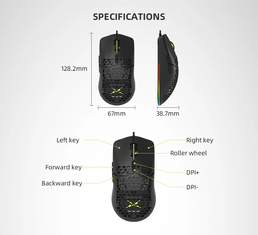 Хорошая недорогая мышь, легкая 67г, для игр самое то! Пришла примерно за 1.5 недели, немного облажался c DPI, лучше брать на 6000