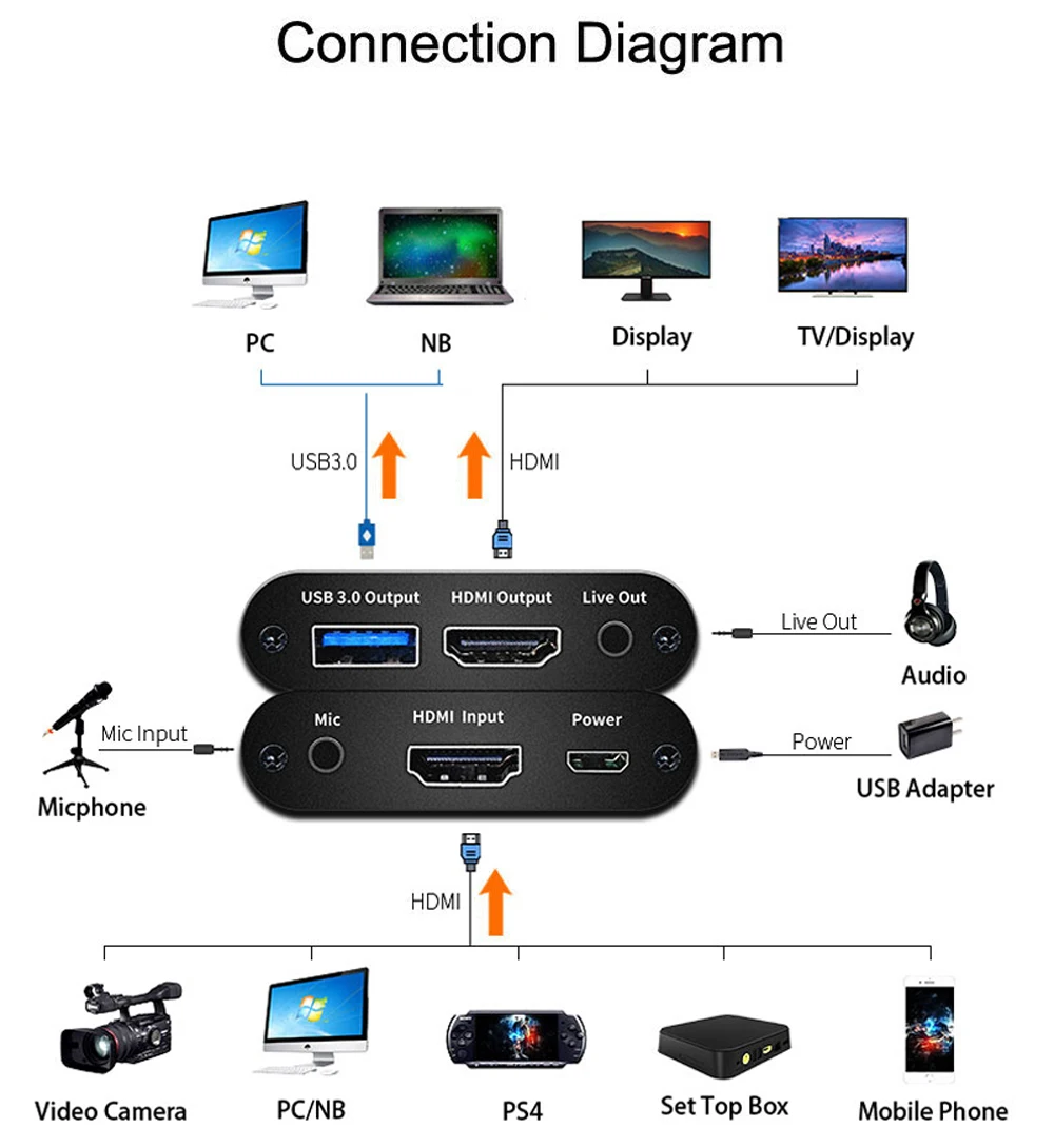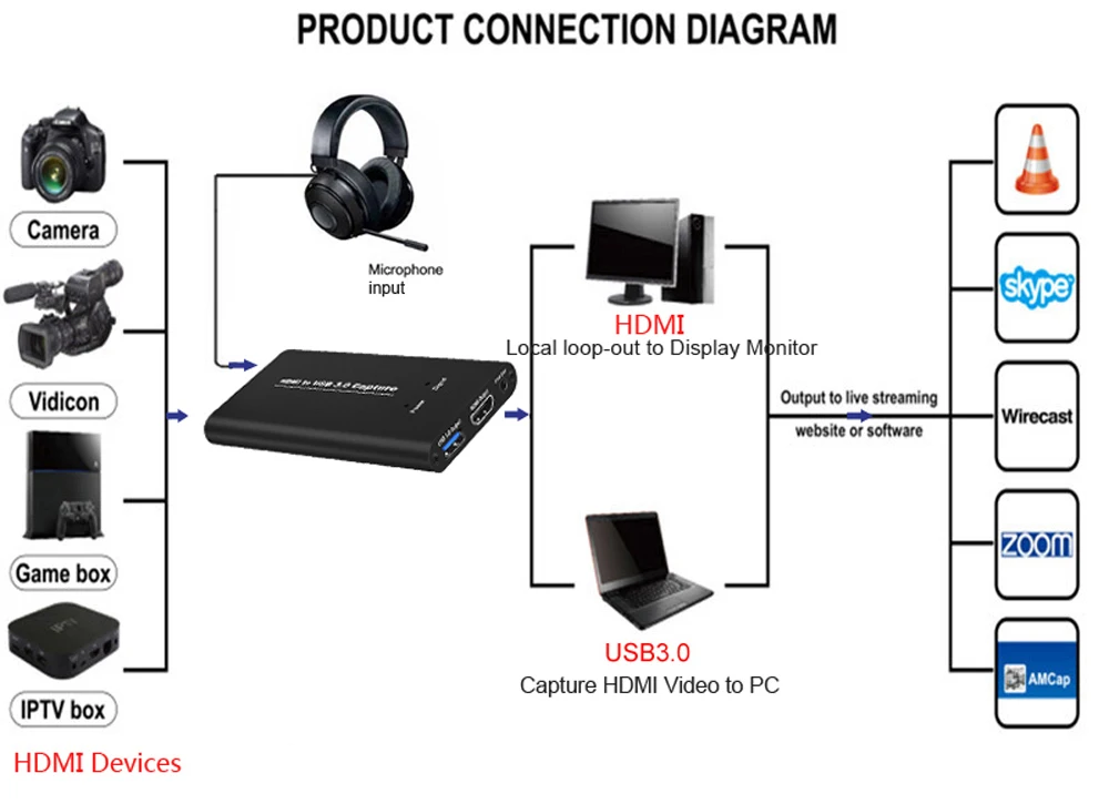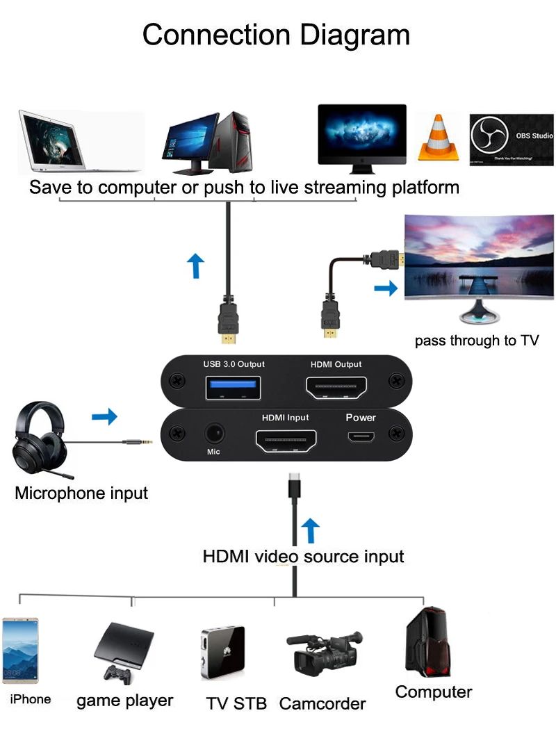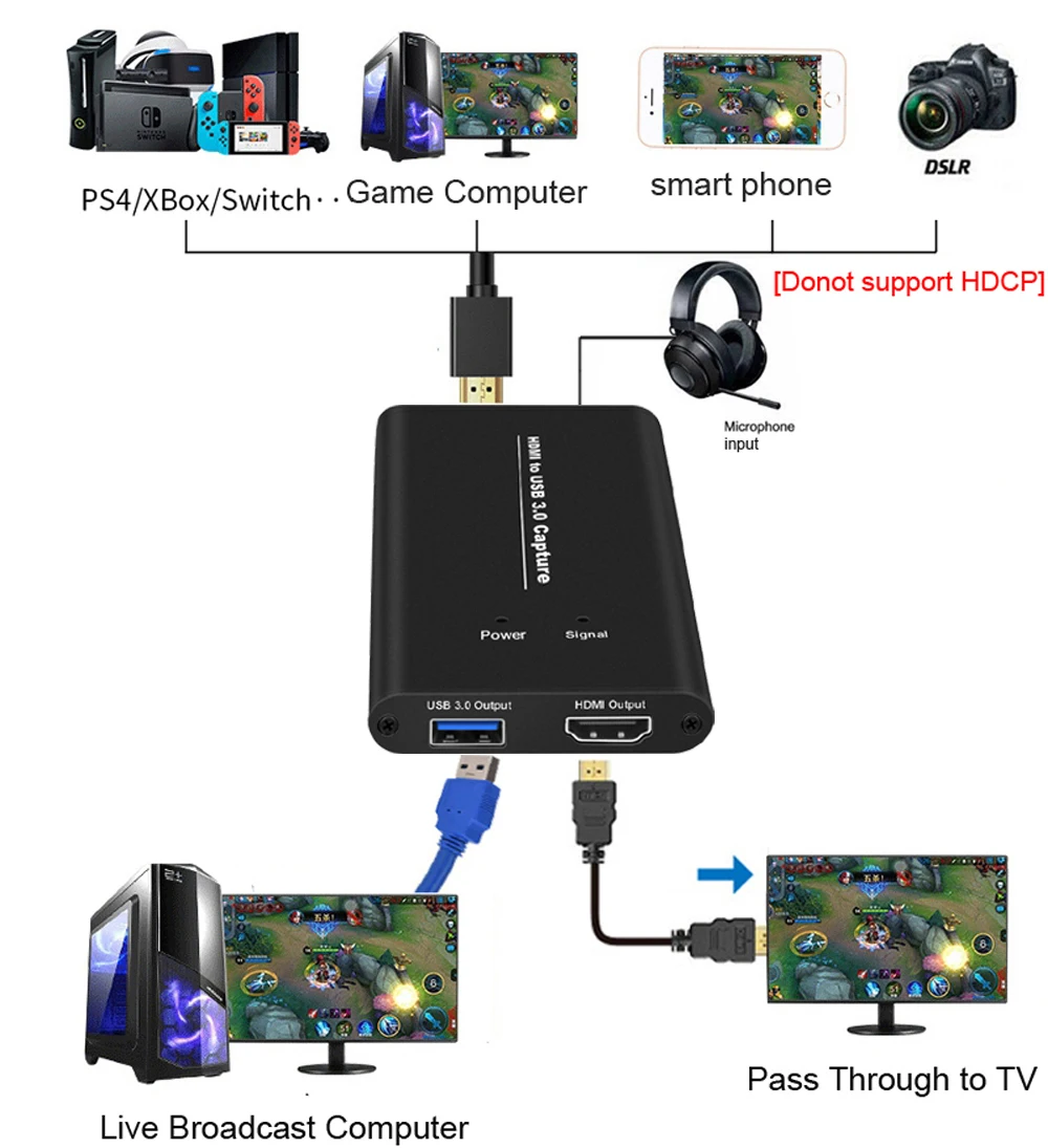 QuickTime Player (OS X); Wirecast (Windows,OS X); vMix(Windows); Potplayer(Windows) и т. Д. 4. Подключение:1. Индикатор сигнала: Этот светодиодный индикатор горит, когда устройство записывает видео нормально.2. Индикатор питания: Этот светодиодный индикатор горит при подключении устройства к порту USB компьютера.3. Выход HDMI: HDMI-hdmi дисплей устройства4.USB3.0 выход: подключение к USB3.0 входу компьютера или ноутбука.5. Микрофон: звуковой вход при записи видео6. Вход HDMI: Подключение источника HDMI от камеры, Vidicon, игровой приставки, IPTV box, для iPhone и т. Д.7. Порт питания: подключите источник питания, когда источник питания недостаточен