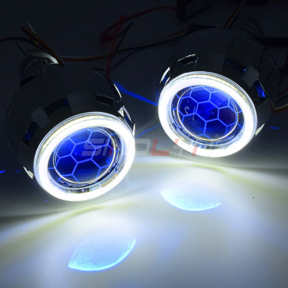 Это новое обновление 8,0 объектив проектора, с ангельскими дьявольскими глазами, синим сотовым дизайном. В светильник производства составляет + 20% ярче стандартных ламп 2,5 ''объектив проектора или в конечном итоге 2,5'' H1 линзы.