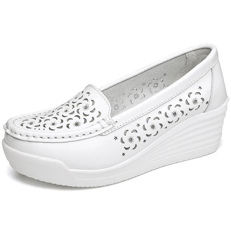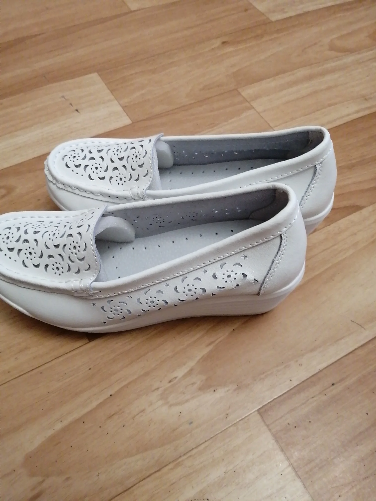 Туфли на танкетке из натуральной кожи; Новые летние мягкие женские туфли; Модные туфли-лодочки; Белые туфли на высоком каблуке для медсестры; Размер 40