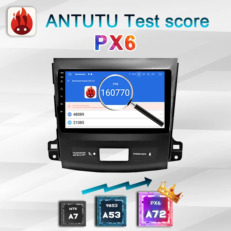 PX6 PX6-лучший чип на рынке в настоящее время, он работает быстрее, чем все другие типы. Балл ANTUTU составляет 160770, что лучше 9853 4G + 64G, PX5 и всех других типов 4 + 64G на рынке. По сравнению с другими радио типа fo, PX6 radio может загружать больше видов приложений android с android market, и приложение может работать лучше.