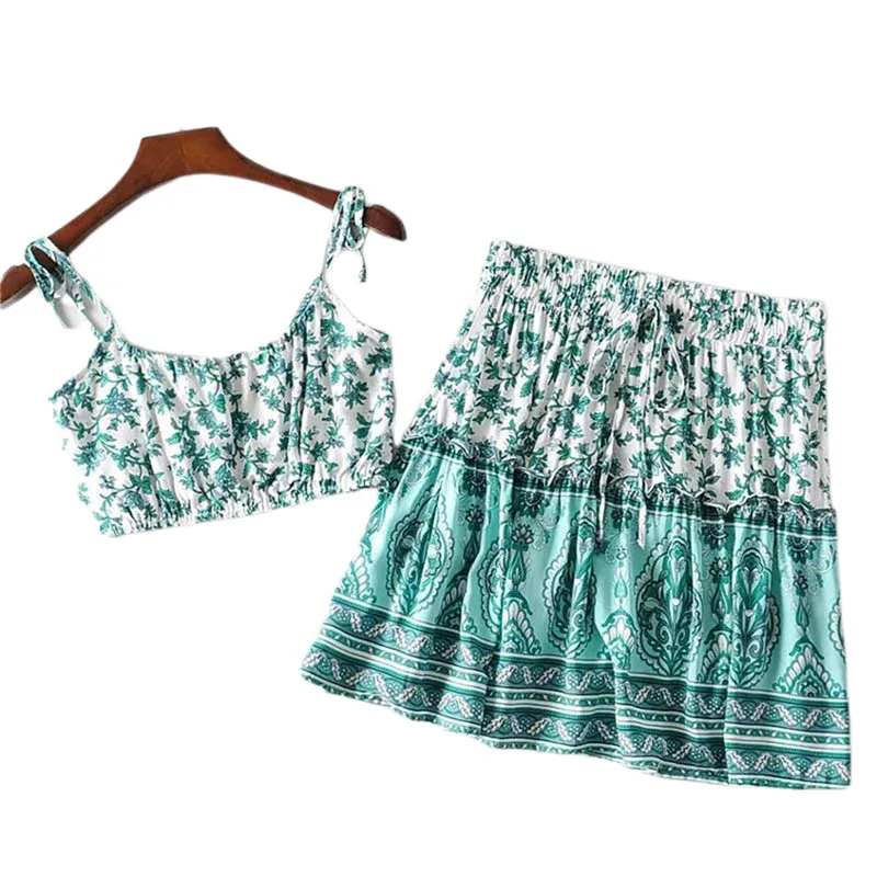 Летний женский комплект из двух предметов с цветочным принтом; Комплект с юбкой и укороченным топом; Юбка трапециевидной формы; Красивая одежда; Костюмы