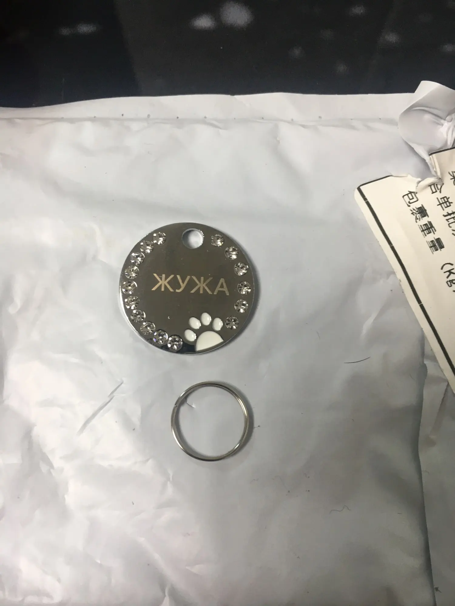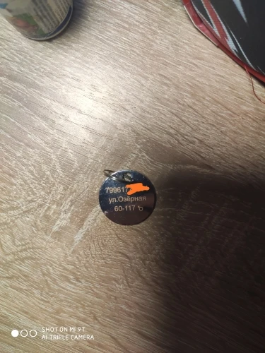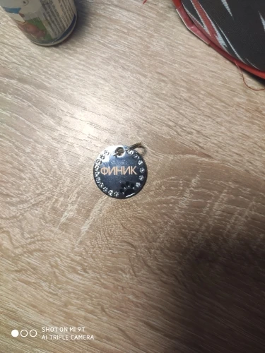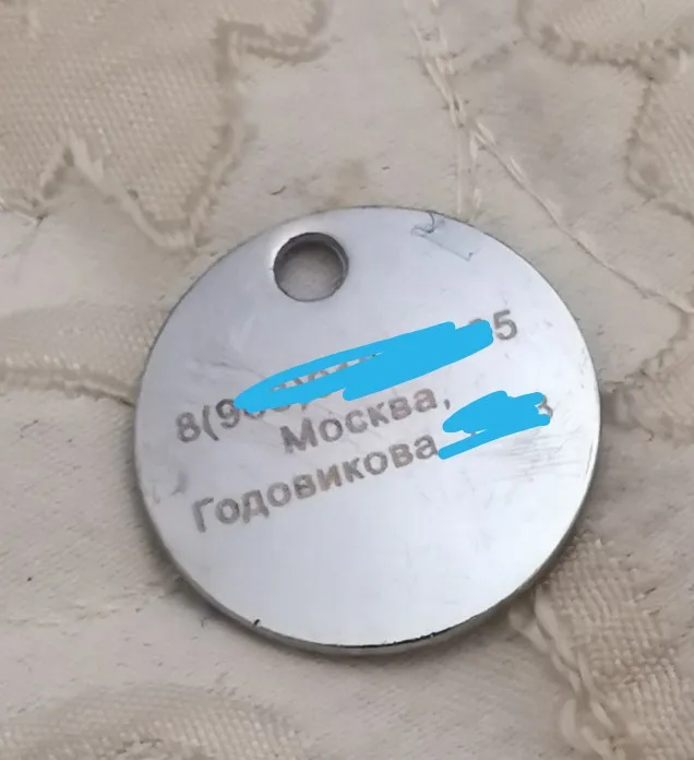 Адрессник маленький, примерно с 5 рублевую монету. Колечко хилое, но благодаря тому, что дырка в самом адресснике, можно подобрать любое другое крепкое кольцо и не потерять. Надписи сделаны на отлично! Пришло через доставку пятерочки за 2 недели.