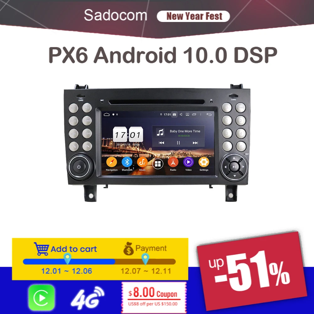 Автомагнитола PX6 на ОС Android 11,0, 4 Гб ОЗУ, 64 Гб ПЗУ, 8-ядерный автомобильный DVD-плеер для Benz SLK Class R171 SLK200280300350552004-2012, радио