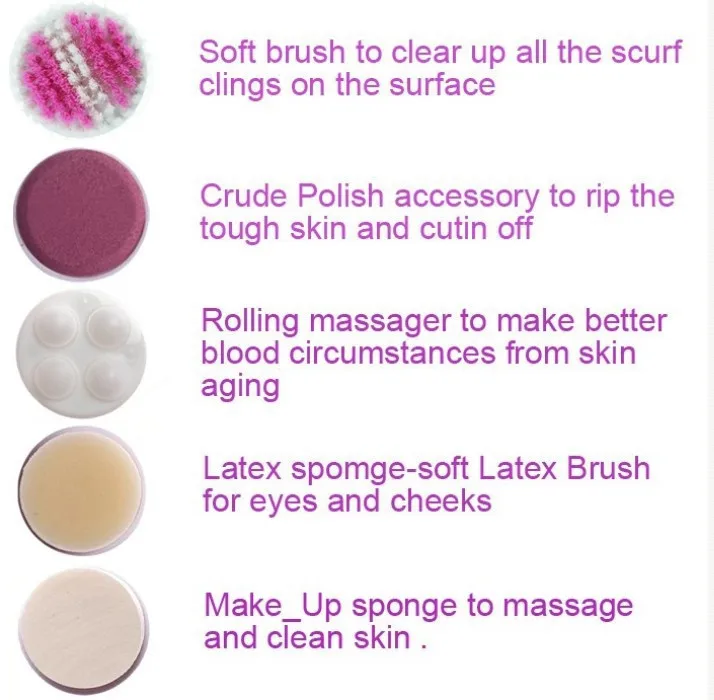 5 x насадок: мягкая щетка, массажер для прокатки, губка для макияжа, латексная губка-мягкая, сырая полировка.