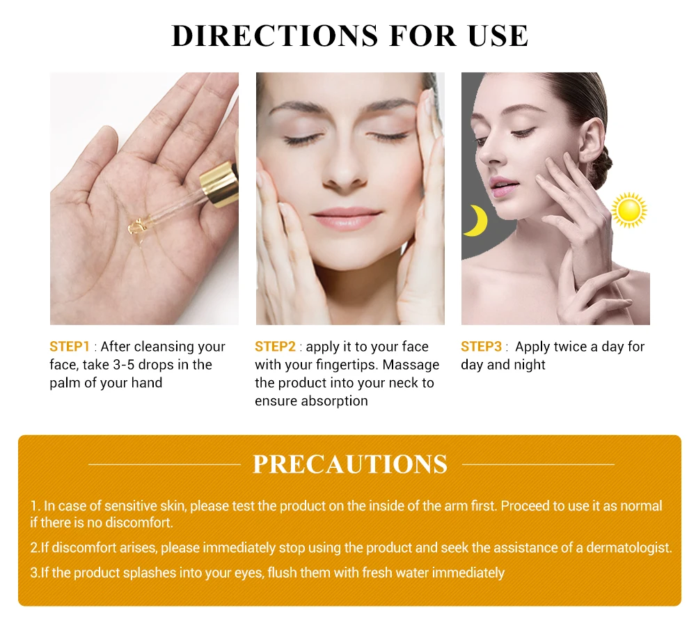 Эффект: содержит высокоактивный маломолекулярный Витамин С с антиоксидантной защитой, этот продукт может предотвратить образование меланина. Также с такими функциями, как отбеливание и осветление цвета кожи, удаление пятен и меланина, он может восстановить здоровье кожи, способствовать обмену веществ в коже и активировать поврежденные клетки кожи, чтобы восстановить эластичность