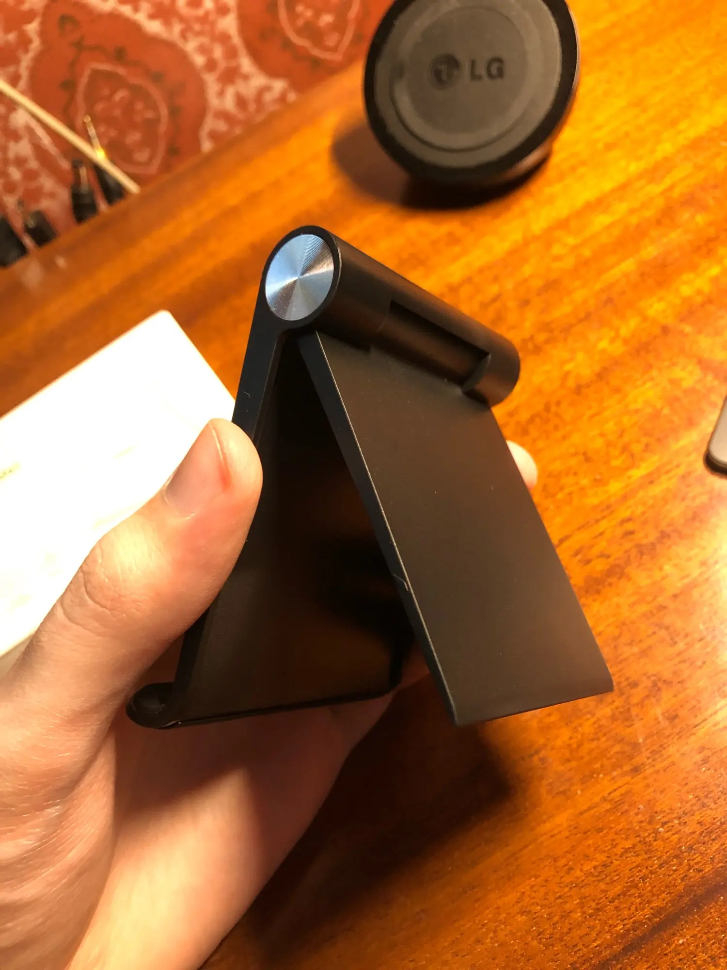Соответствует описанию. Регулировка наклона не дерзкая, но гладкая. Очень мило Держать на столе: я использую его и для смартфона, и для планшета. Очень рекомендую эту подставку!