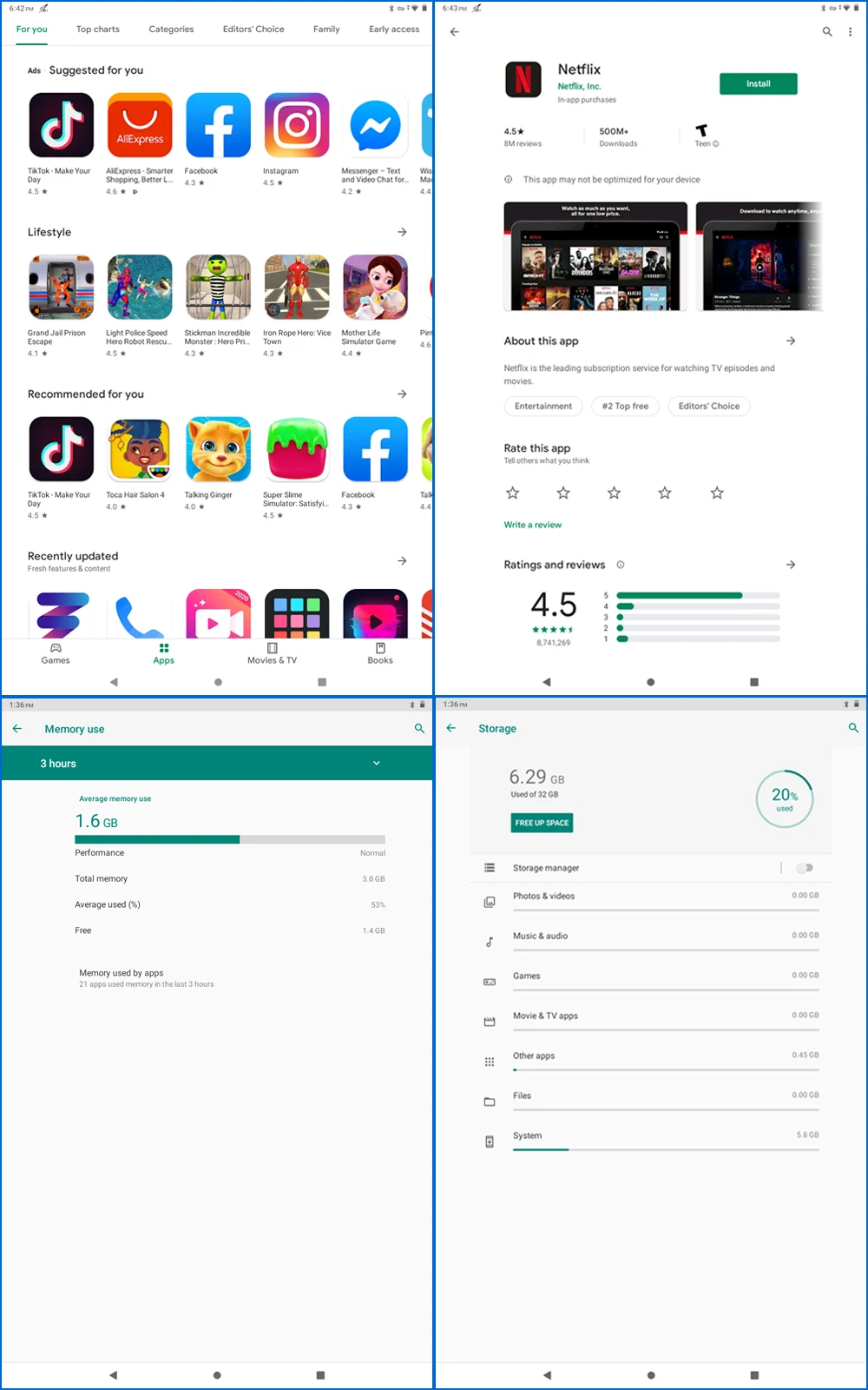 Восьмиядерный процессор + 3 ГБ ОЗУ 32 Гб ПЗУ + новая Android 9,0 Pie система + WIFI 4G LTE сеть + 10-дюймовый экран 1280*800 IPS + порт USB Type C
