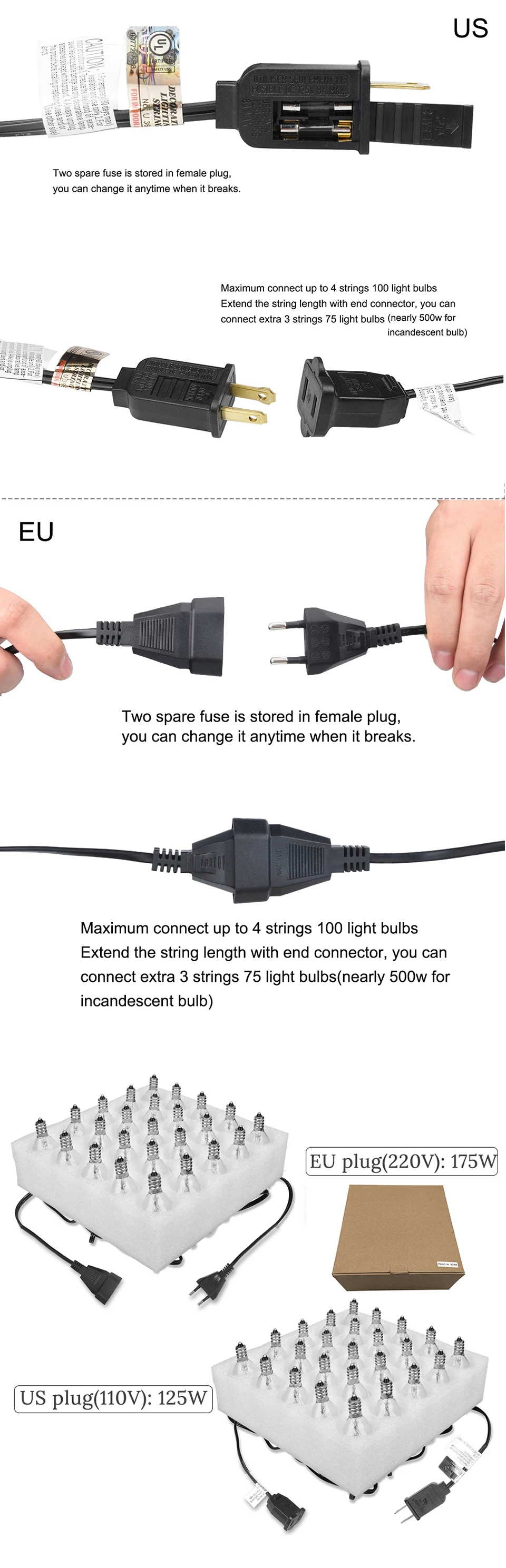 Примечание:Мы отправляем дополнительные лампы для 30 футов 50 футов струнный светильник, так что вы можете заменить лампу, как только она сломана.Если только Запасная лампа сломана, компенсация не будет произведена. Не волнуйтесь, вы можете проверить нашу розничную упаковку, это сложнее, чем у других поставщиков.