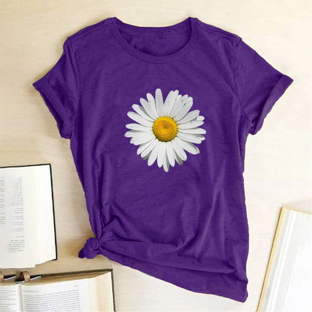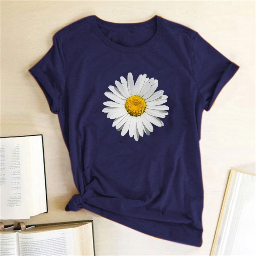 Футболка женская хлопковая с круглым вырезом, повседневная Простая рубашка с принтом маргариток, цветы, на лето