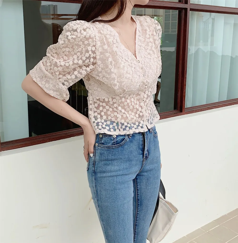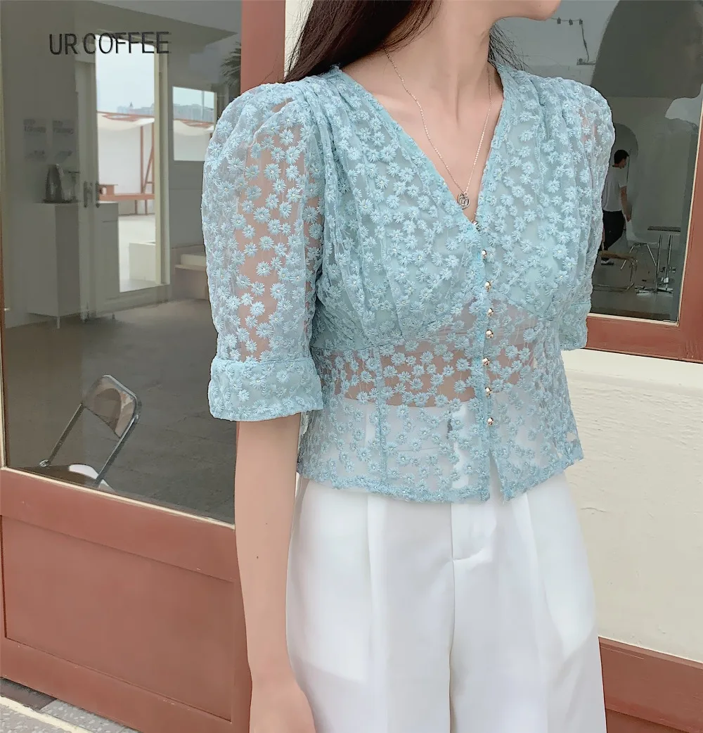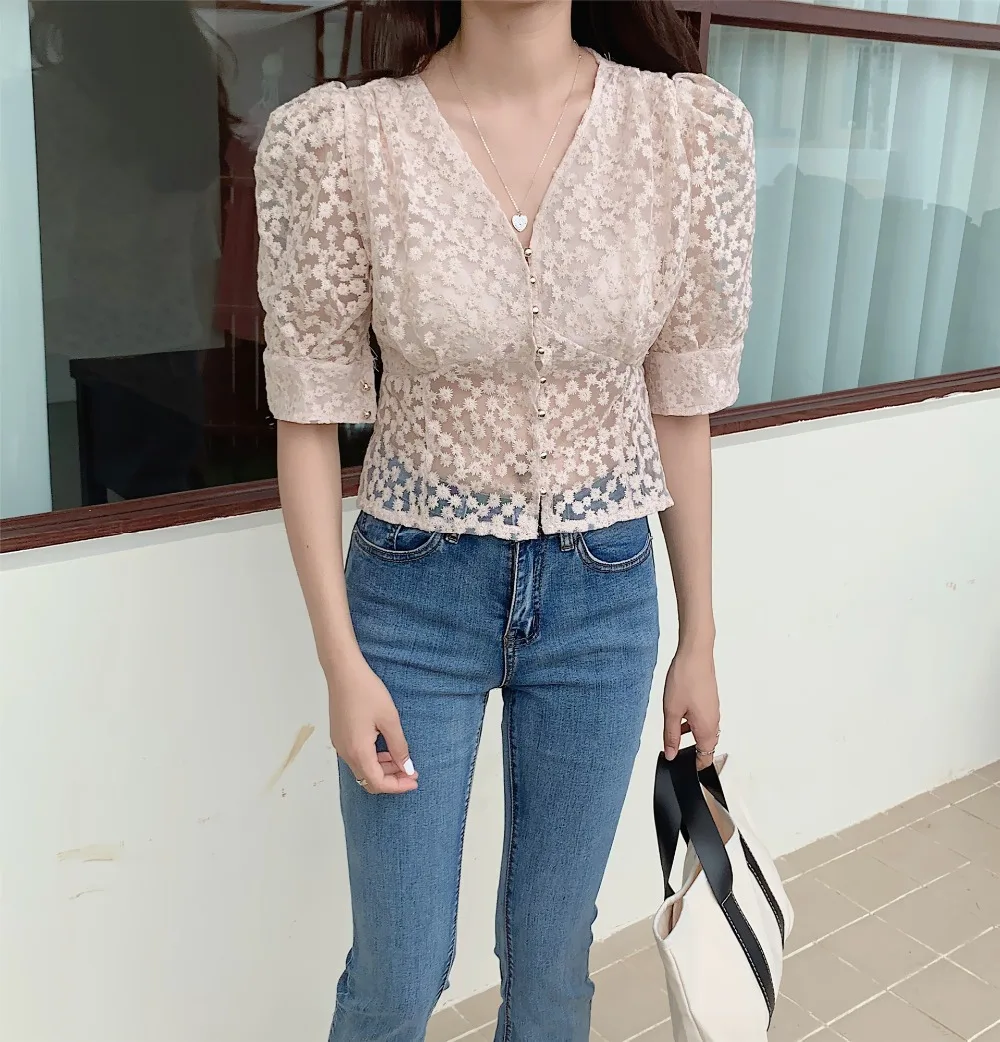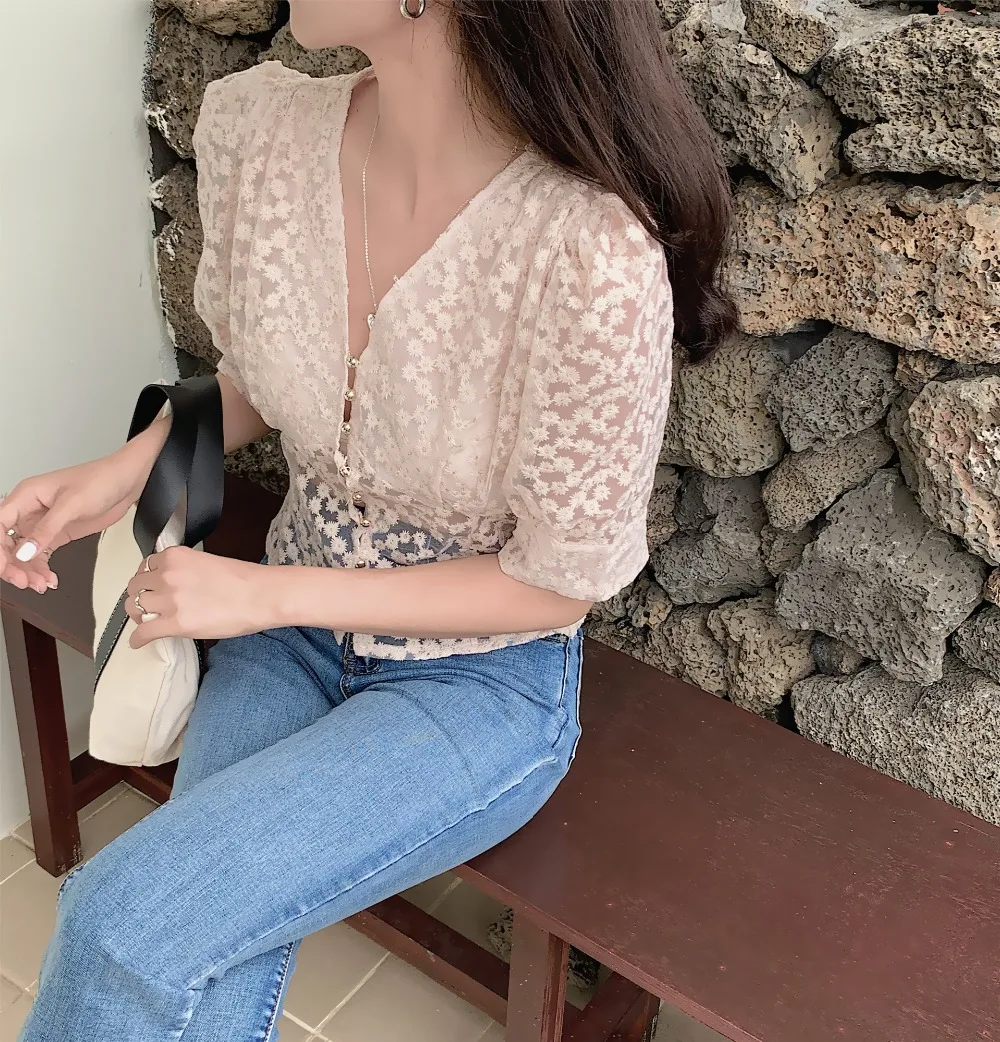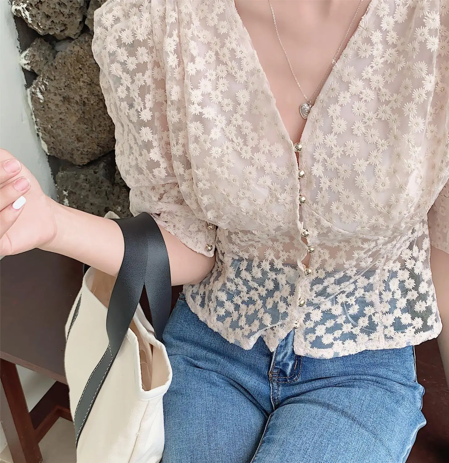 Блузка Alien Kitty Женская однотонная с V-образным вырезом, пикантная кружевная универсальная однобортная рубашка с цветочным принтом, в Корейском стиле, лето 2021