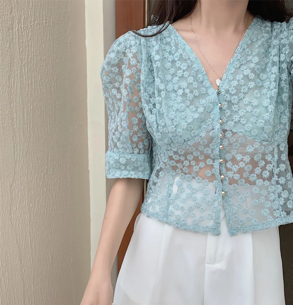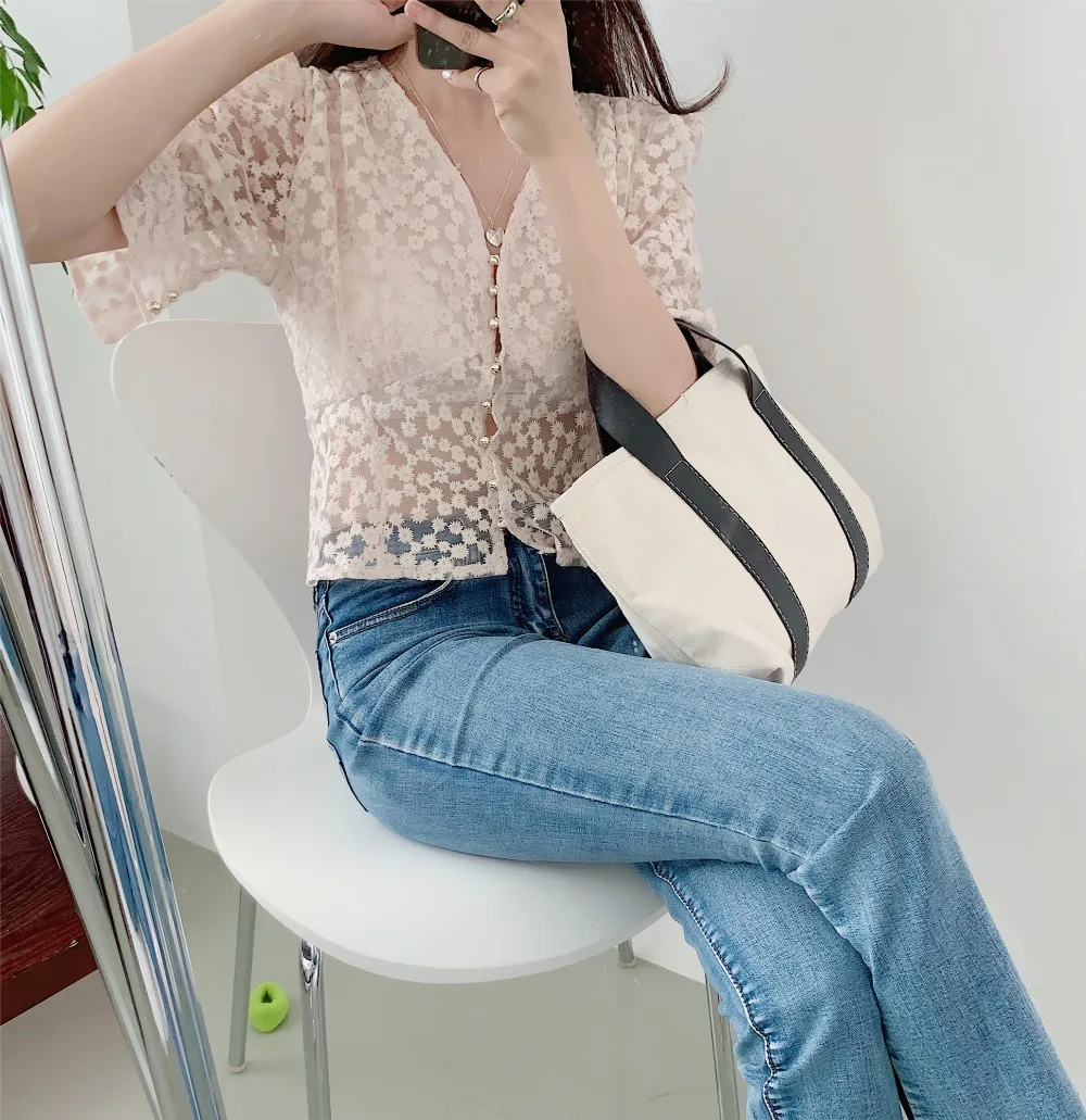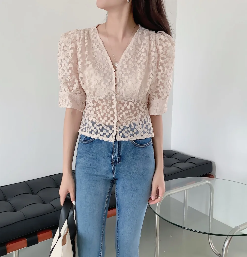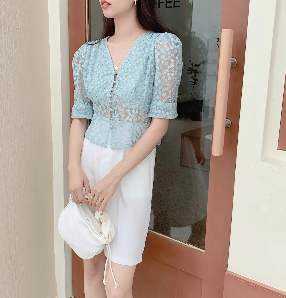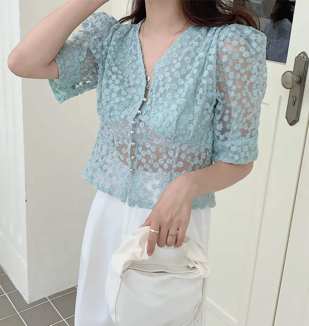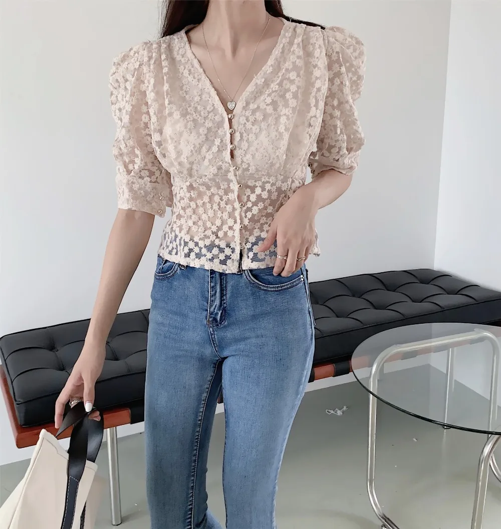 Блузка Alien Kitty Женская однотонная с V-образным вырезом, пикантная кружевная универсальная однобортная рубашка с цветочным принтом, в Корейском стиле, лето 2021