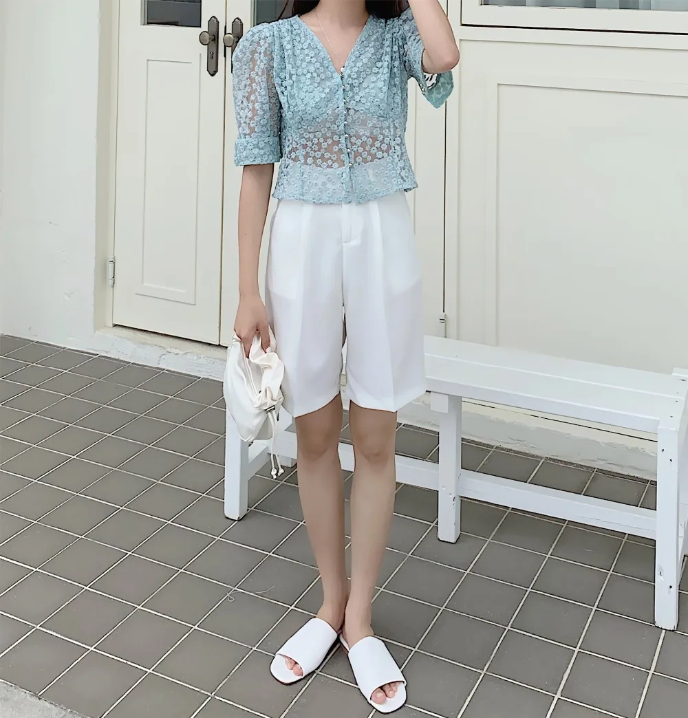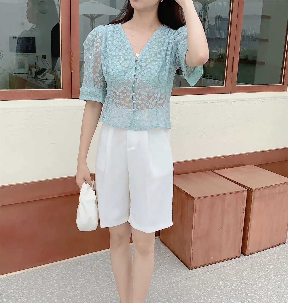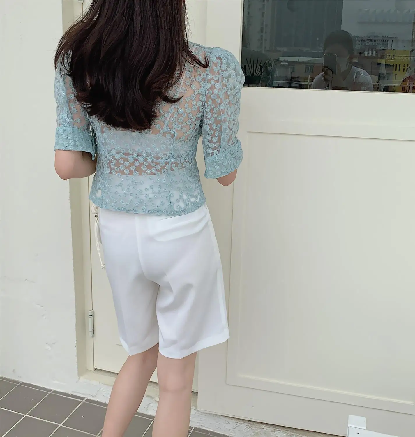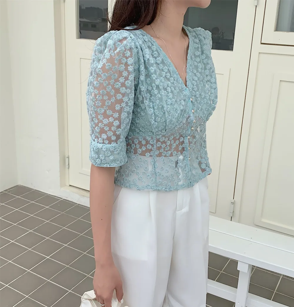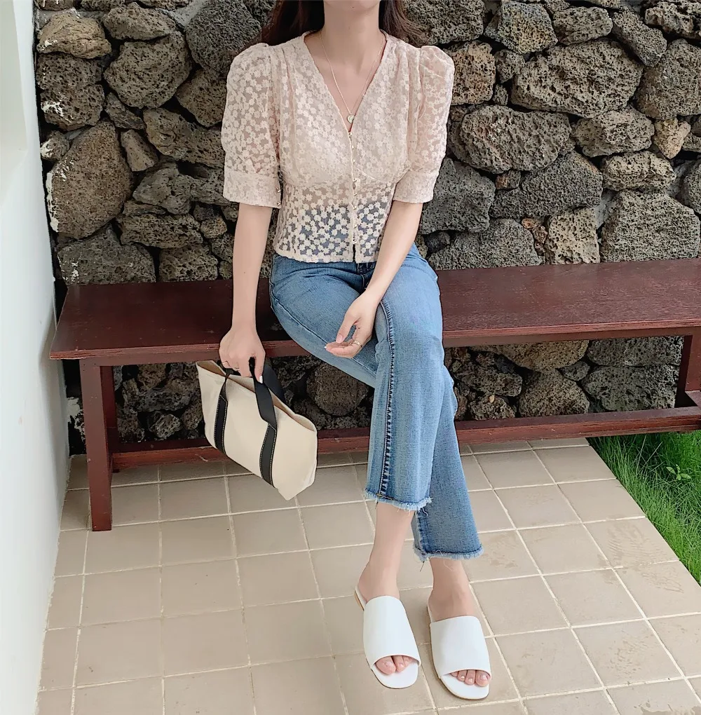 Блузка Alien Kitty Женская однотонная с V-образным вырезом, пикантная кружевная универсальная однобортная рубашка с цветочным принтом, в Корейском стиле, лето 2021