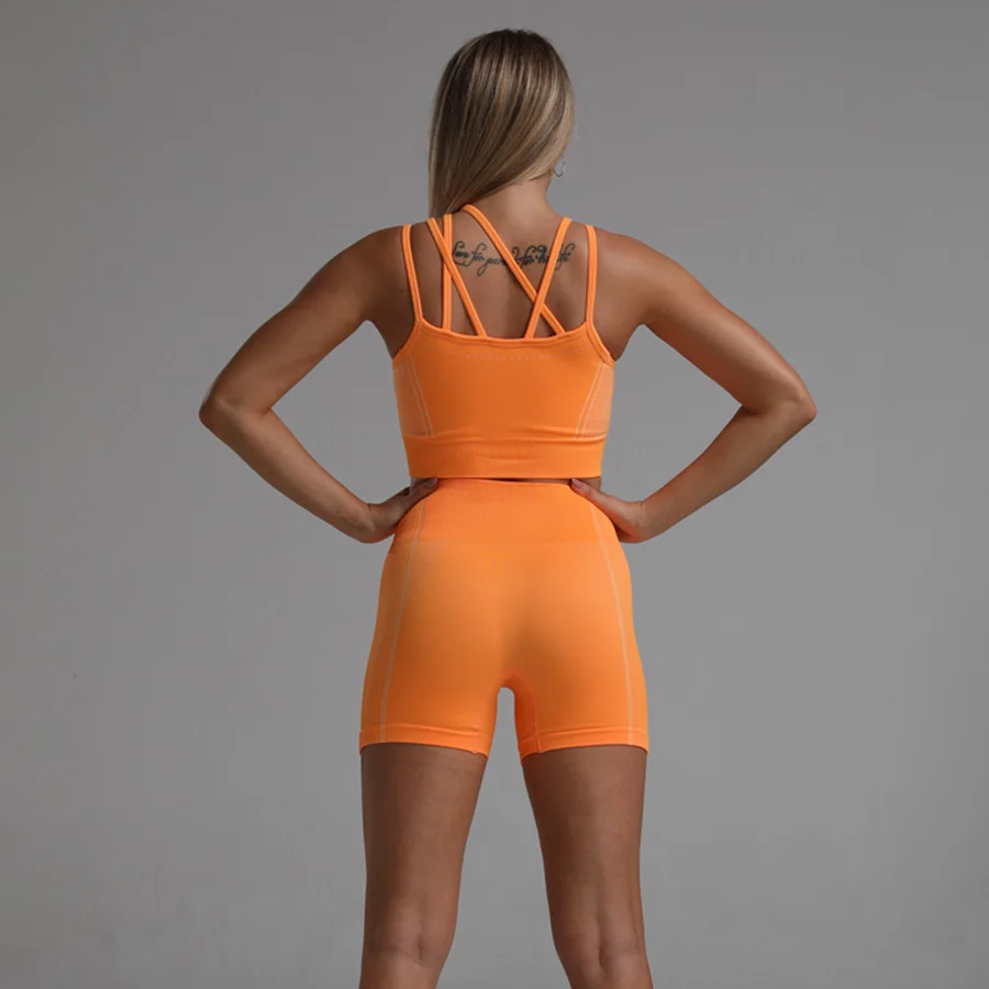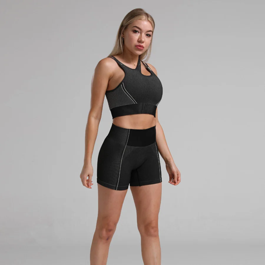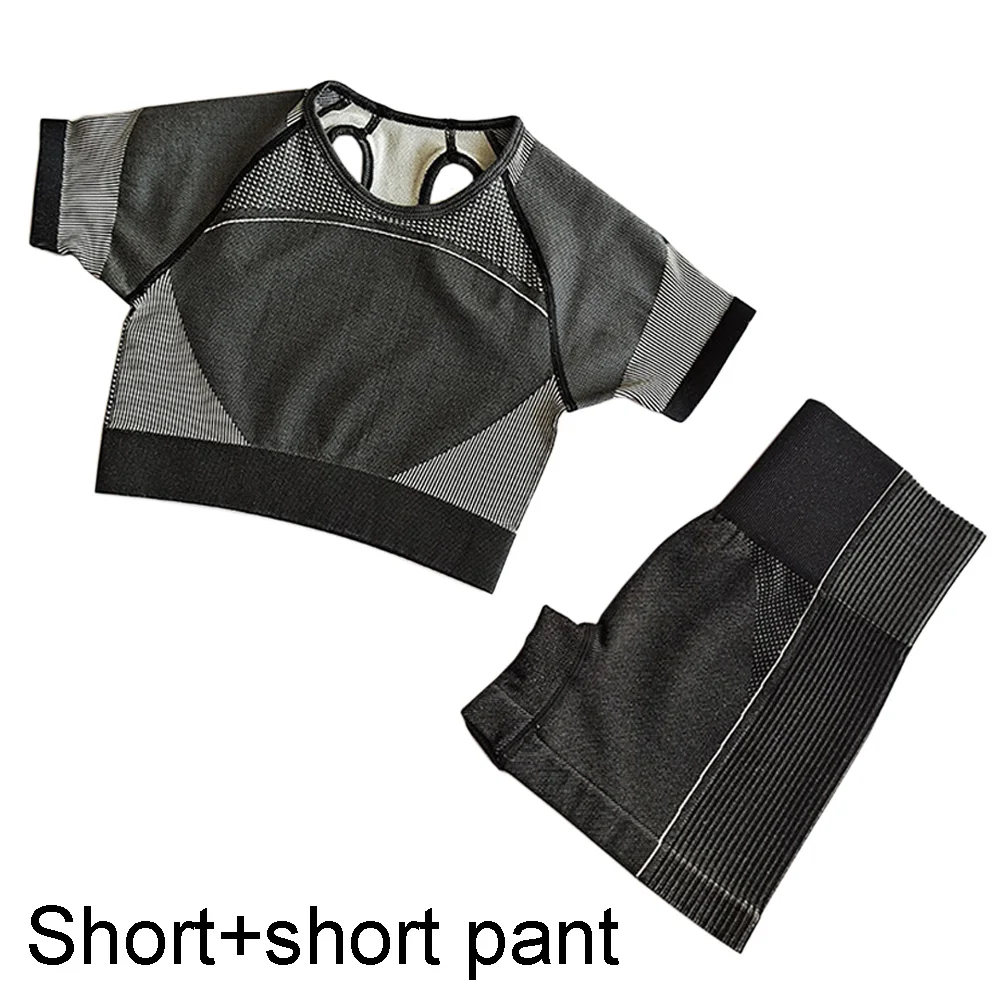 Женский комплект для йоги из 2 предметов, летний спортивный бесшовный спортивный костюм, бюстгальтер, одежда для спортзала, укороченный топ, рубашка, шорты с высокой талией, спортивная одежда