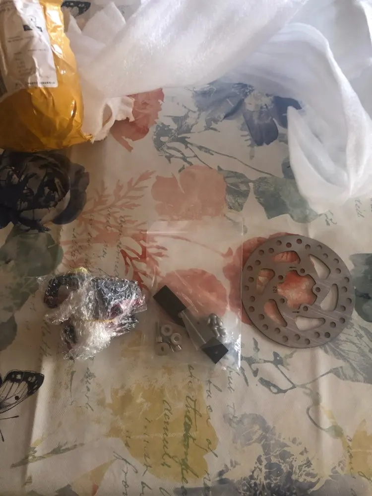 Пришло в пакете обмотанные в спец материал в магазин Пятерочку так было написано что быстрее и в правду оказалось быстро две с половиной недели качество пока не поставлю не проверю не пойму, выглядит хорошо, 120 диск и сам тормоз с проставкой на m 365.