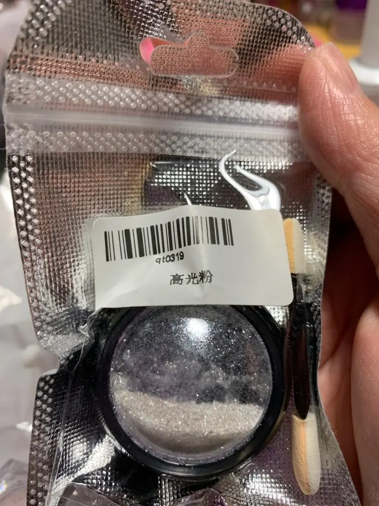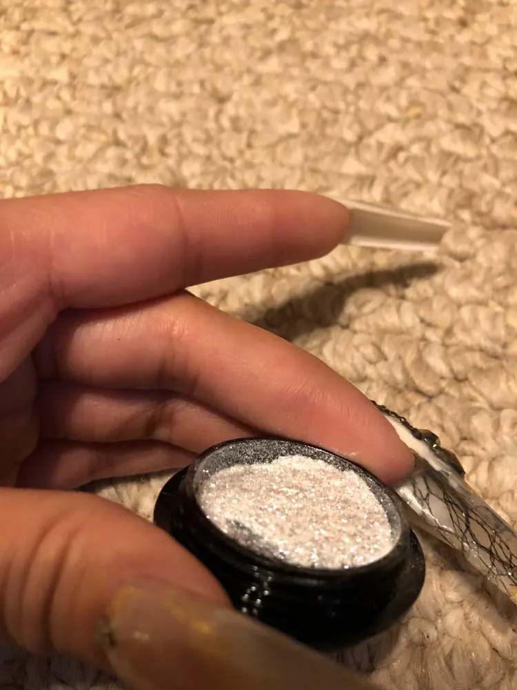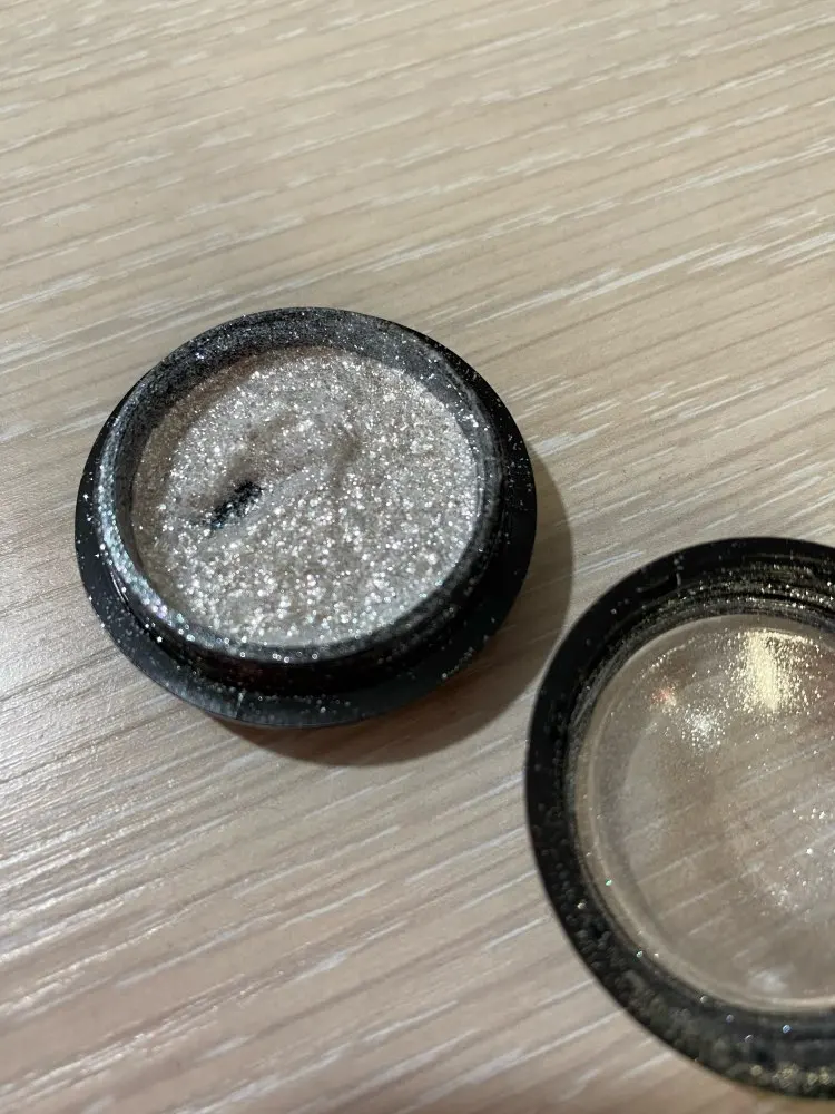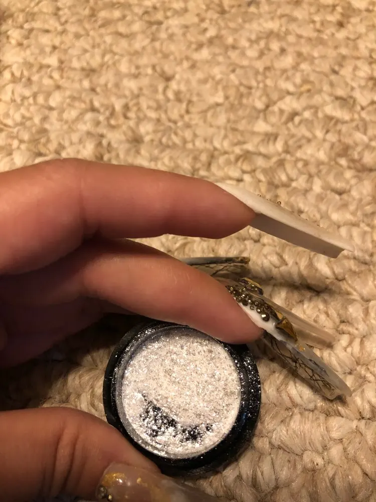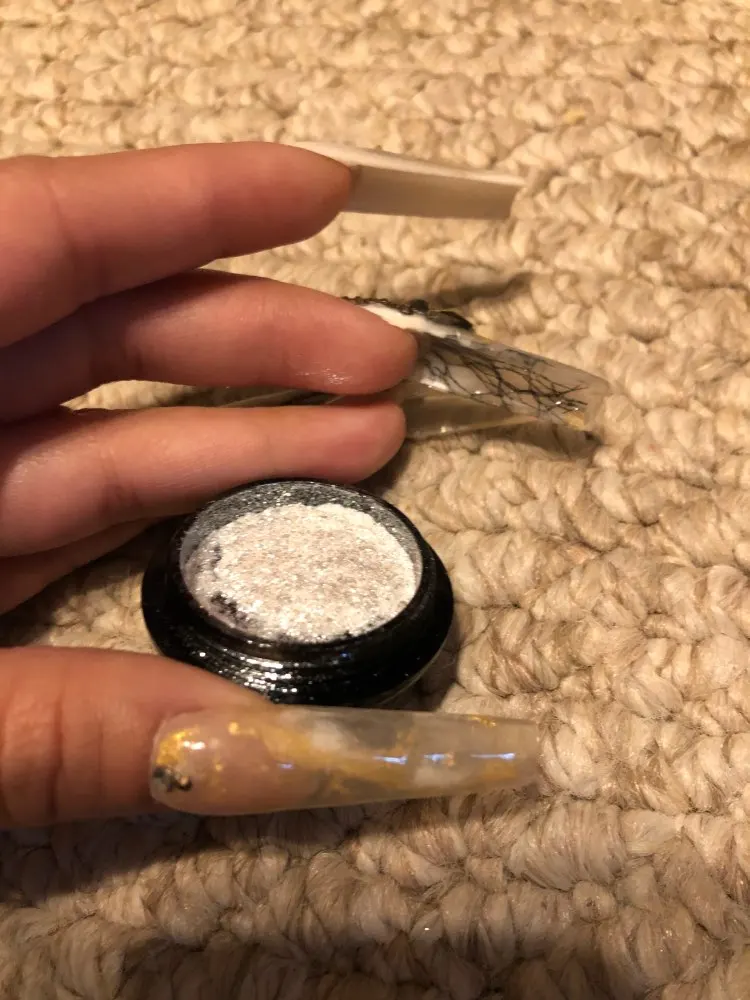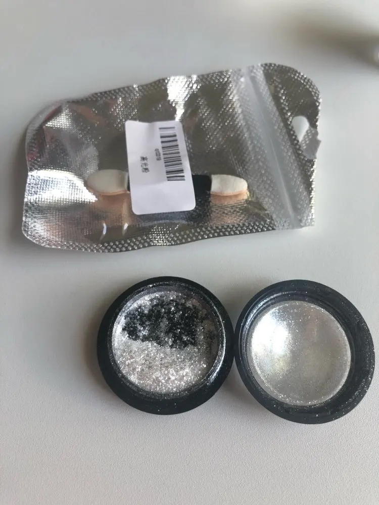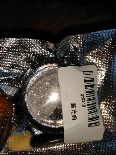 Красивый порошочек. В баночке смотрится очень красиво. Искрится серебром. Как втирка и как посыпушка на ногтях смотрится не красиво, но его можно размешать с топом или базой и делать прорисовки. Особенно красиво в мраморных дизайнах. Планирую использовать именно так. Наполнение пол баночки. Спасибо.