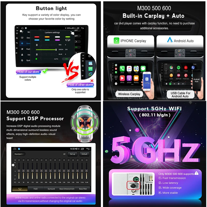 > Булит-в DSP процессор, многомерные объемные звуковые эффекты без потерь, наслаждайтесь аудио-визуальным пиром высокой четкости (только для M300 M500 M600 есть).