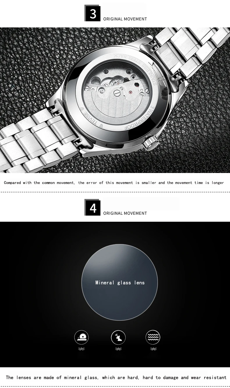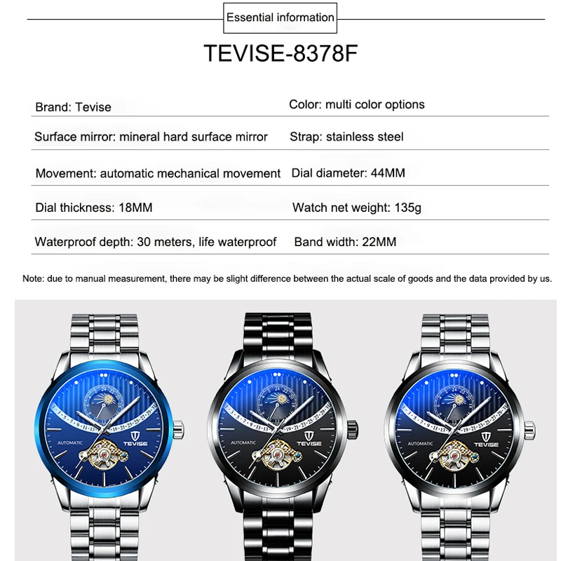 Название бренда: TEVISE Номер товара: T8378F Стиль: спортивный, Повседневный, деловой Дисплей: Аналоговый Материал застежки:Нержавеющая сталь Материал ремешка: нержавеющая сталь, кожа Форма циферблата: круглая Материал корпуса: нержавеющая сталь Тип короны: спиральная Корона Материал зеркала: твердое стекло Механизм: механические Автоматические часы Характеристика: -Передовые технологии производства; -Крутой и специально разработанный большой экран дисплея; -Корона часов с экологическим гальваническим покрытием; -Пряжка из нержавеющей стали и чехол с логотипом TEVISE; -Водонепроницаемость 30 метров (не для плавания или душа) -Специальные Особенности: Водонепроницаемость, Автоматическая Дата.