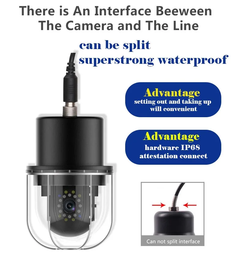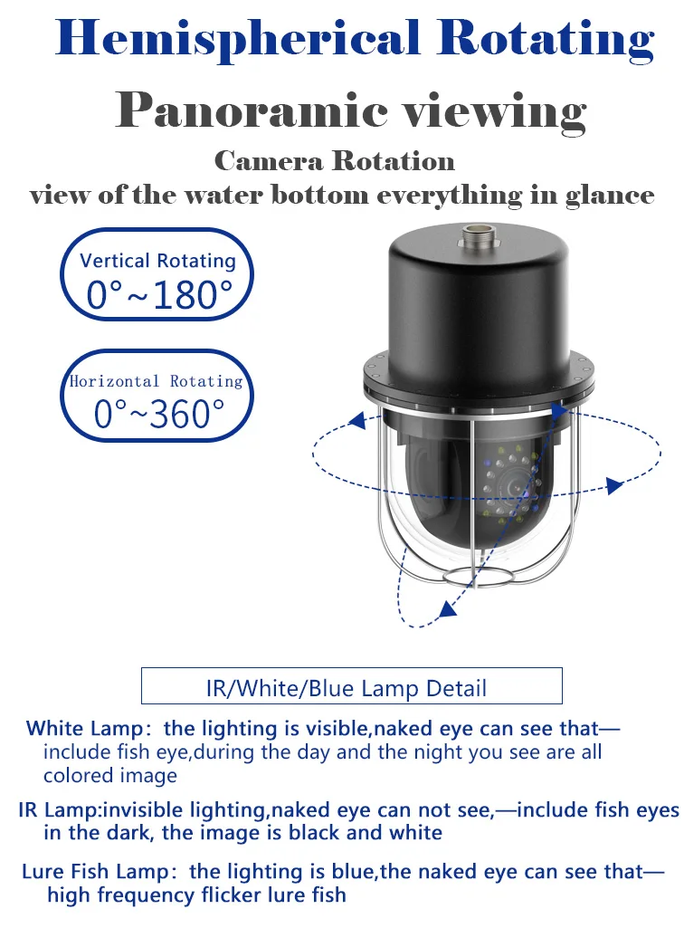 1. Датчик изображения: 1/3 "HD Цвет CCD 2. Горизонтальное разрешение: 800 ТВЛ 3. Размер фокуса объектива: 3,6 мм 4. Угол обзора: 92 5. Светодиодный: всего 20 шт.: 6 шт. Белый светодиодный + 1 2 шт. ИК-светодиодный + 2 шт. синий светодиодный (для заманивающих рыб); Светодиодный режим переключения: только белый светодиодный, только ИК-светодиодный только синий светодиодный on, все светодиодный on, все Светодиодный off 7. Угол поворота: вертикальное вращение 0-180 градусов; Горизонтальное rotating0-360 градусов 8. Расстояние подводного видения: 1-3 м, в зависимости от четкости воды 9. Потребление тока: 400 мА 10. Конструкция корпуса: металл + АБС-пластик 11. Водонепроницаемый уровень: IP68 12. Источник питания: 12 В постоянного тока 13. Размер камеры: 83*125 (мм)