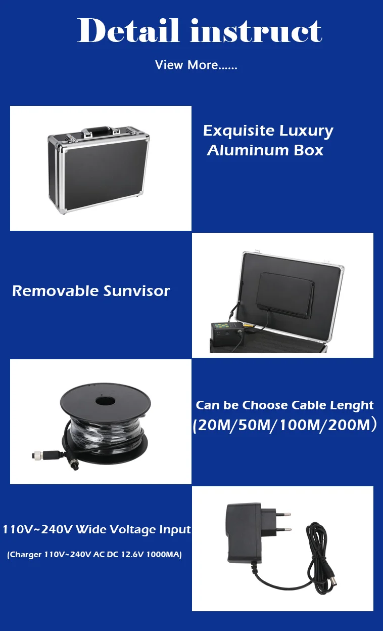 1x9 дюймовый цветной TFT ЖК-монитор 1 x TF карта 8G 1 x подводный Камера 1 x кабель 20 м/50 м/100 м 1 х зарядное устройство 12 В постоянного тока 1 x пульт дистанционного управления 1 x Алюминий коробка