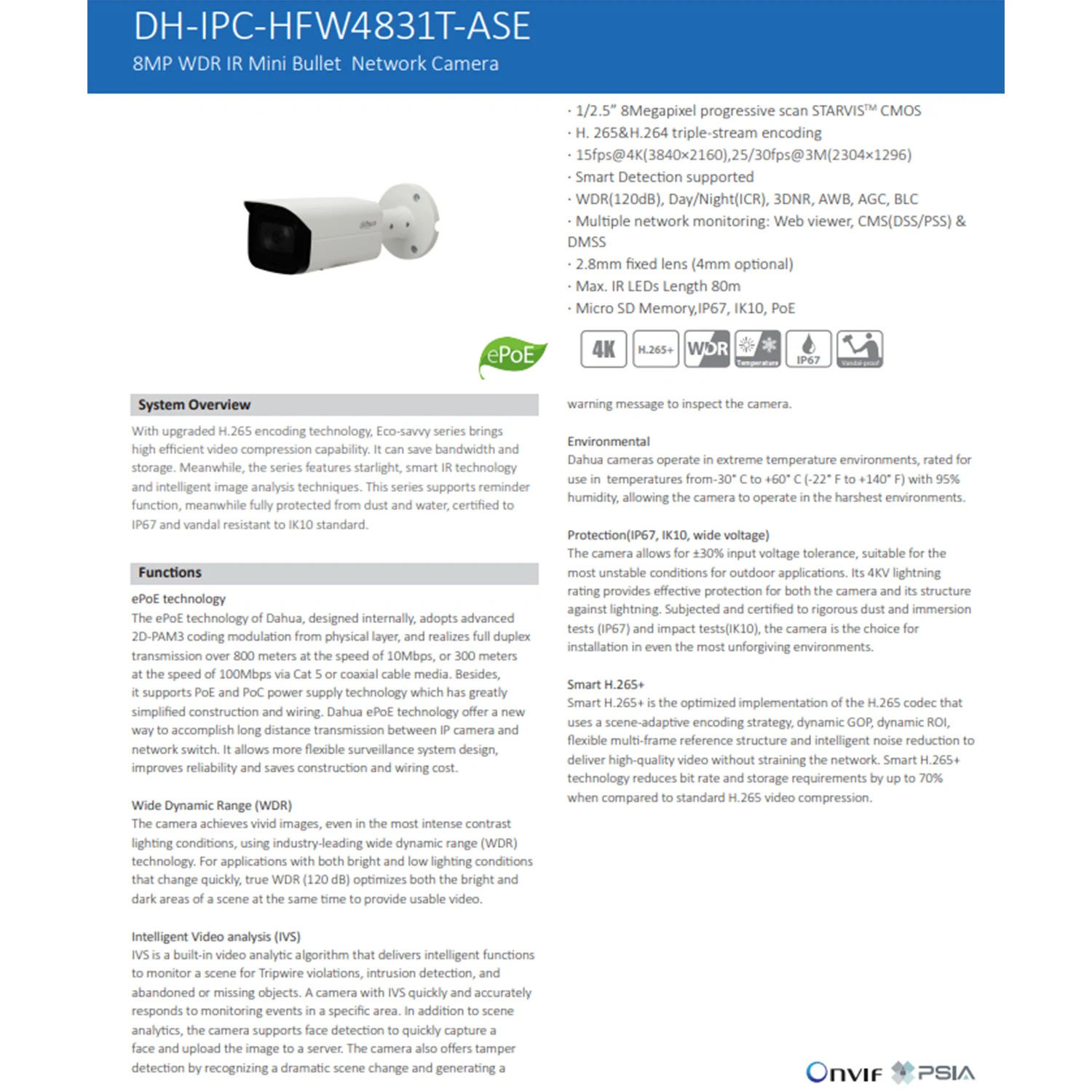 Камера Dahua 8-мегапиксельная 4K POE Starlight, стандартная, IP67 IK10 IR80 WDR, инфракрасная сетевая мини-камера, Оригинальная английская версия