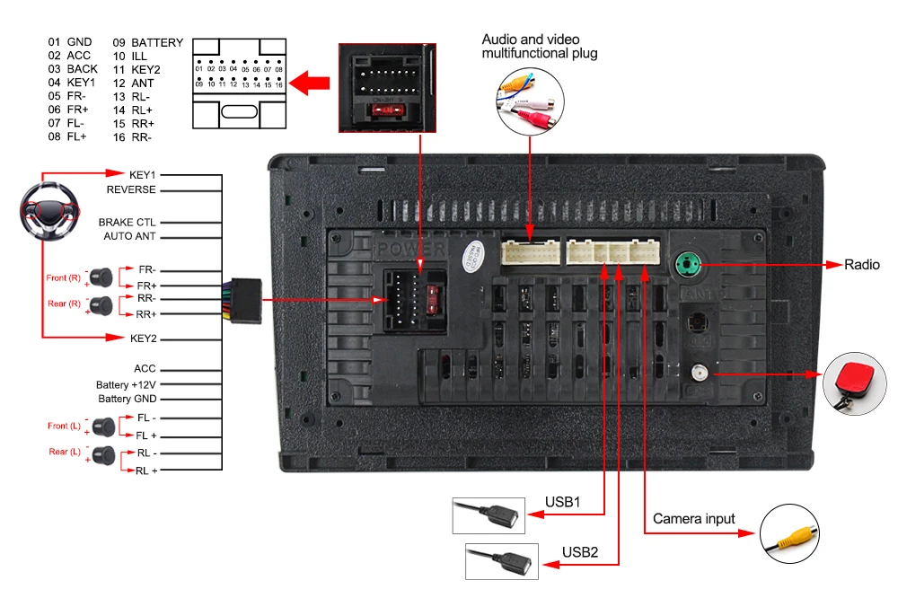 > Когда автомобиль находится на заднем ходу, Этот автомобильный DVD автоматически переключается на задний вид изображения камеры с помощью парковочной линии.> вы можете смотреть видео на радио, подключив USB. Легко подключить и легко смотреть.