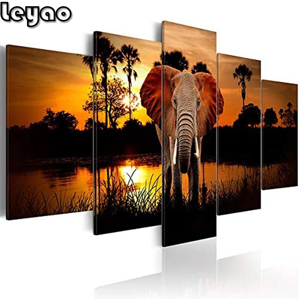 5 панелей в комплекте, африканский слон, алмазная вышивка, полный квадрат, круглая Алмазная картина, наборы крестиков, 5D мозаика, домашнее искусство,
