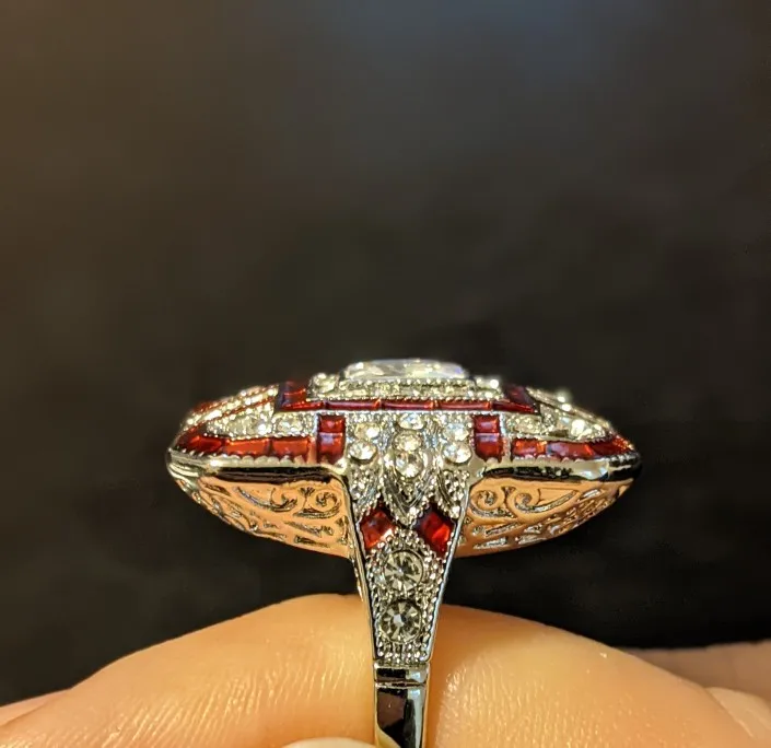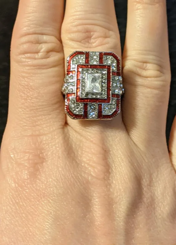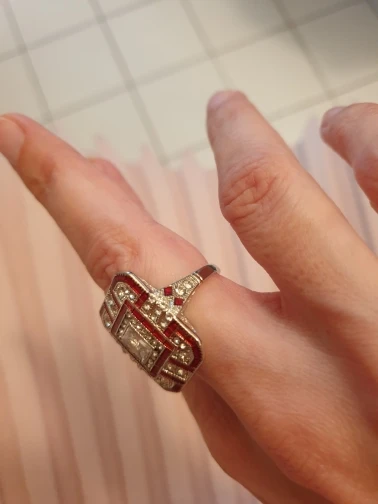 Несмотря на то, что кольцо на фото отличается от того, что прислали (красный цвет не из камушков, а порисован красной эмалью, видимо), оно очень симпотичное.