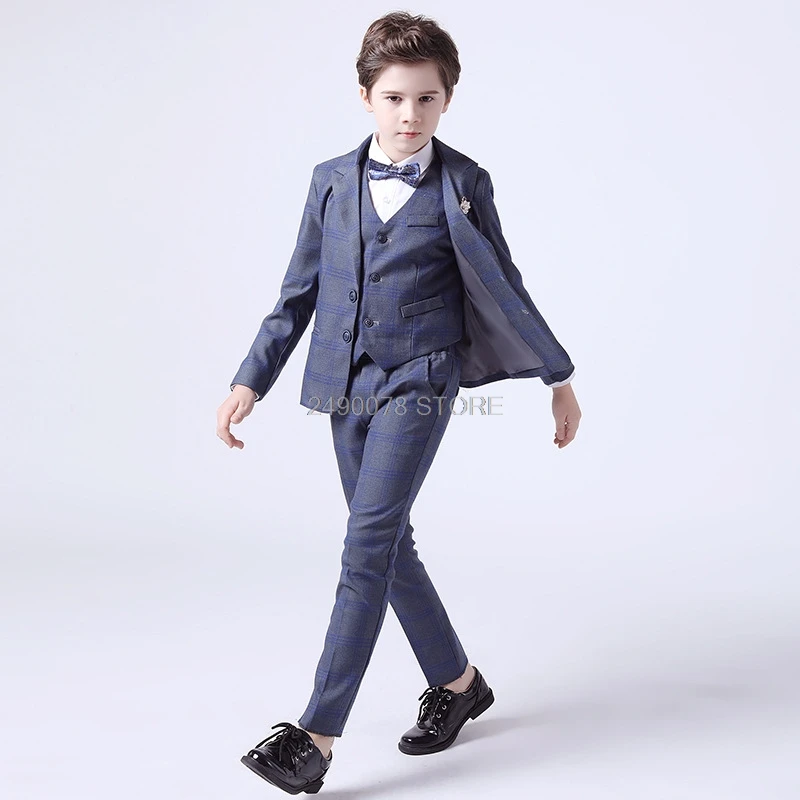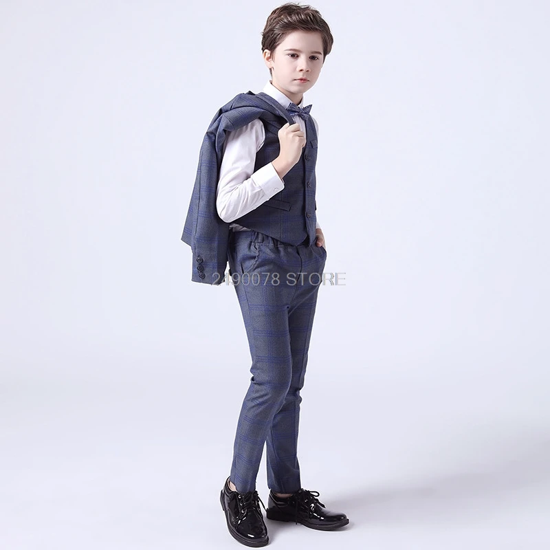 Роскошный костюм на свадьбу для мальчиков; Клетчатая куртка в стиле принцессы; Жилет и брюки; Платье с бантом; 4 предмета; Детский костюм для выступлений на фортепиано