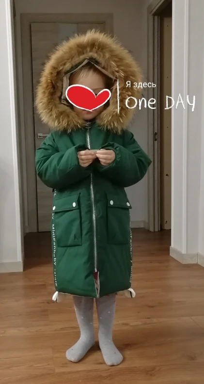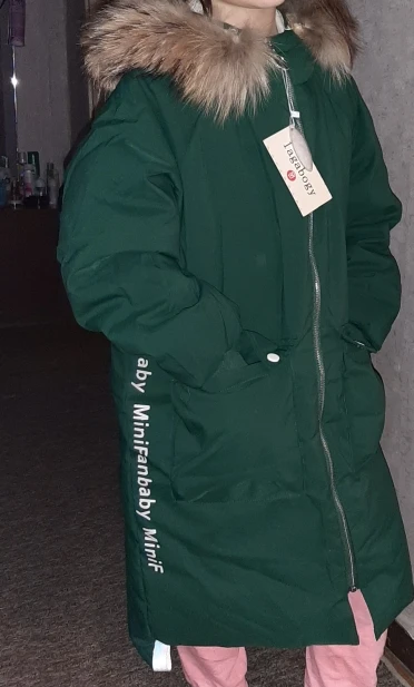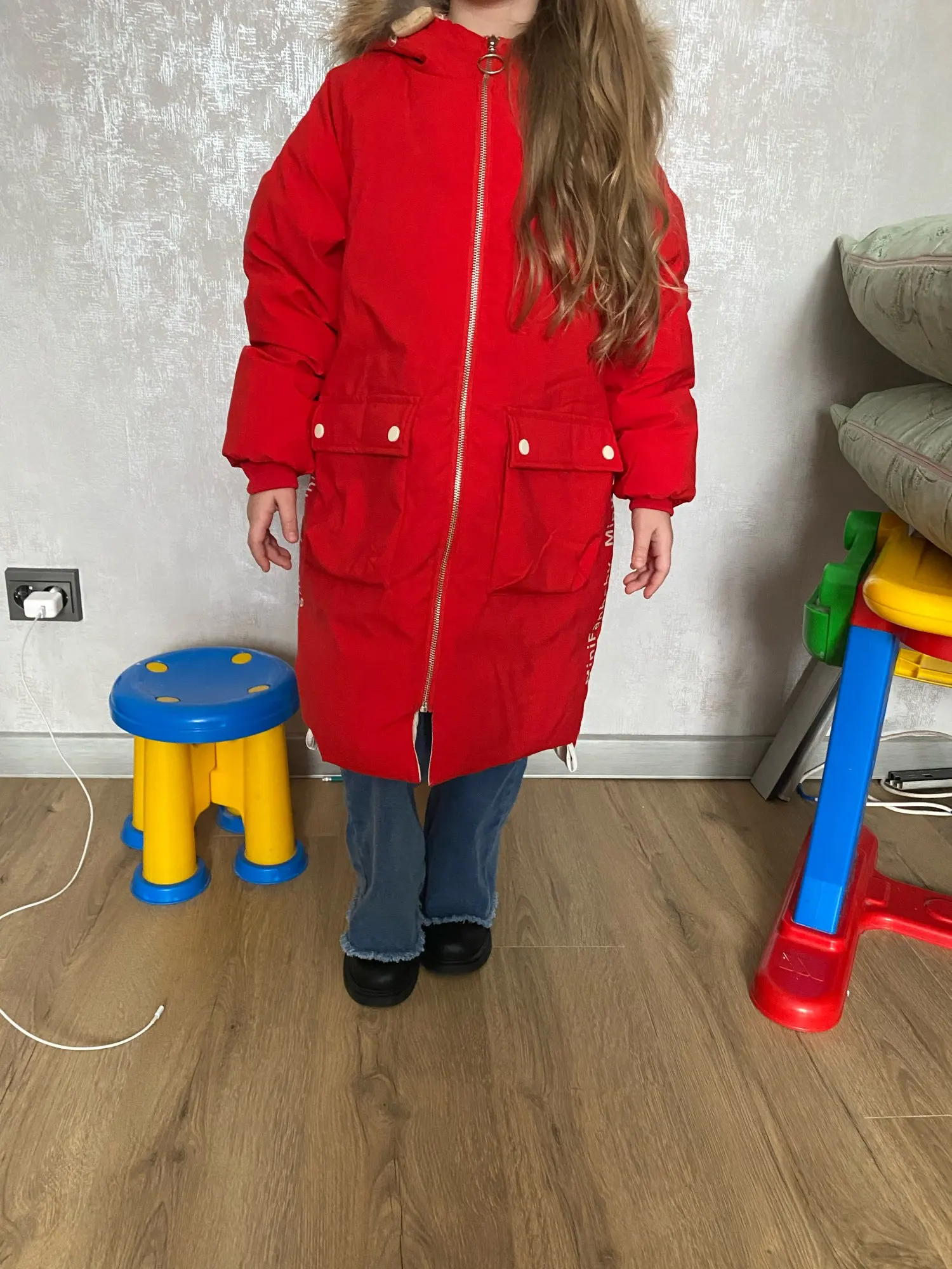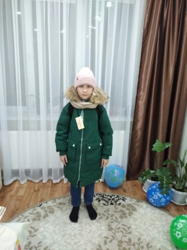 Курточка очень красивая, сейчас ребёнку 8 лет, рост 132 см, пуховик ниже колена, в стиле оверсайз. Идеально для юбок, школьных брюк, джинсы- будет точно тепло. Очень красивый зелёный цвет, чистый, глубокий. Удобное крепление на молнии, есть Курточка лёгкая. Ребёнок в восторге.