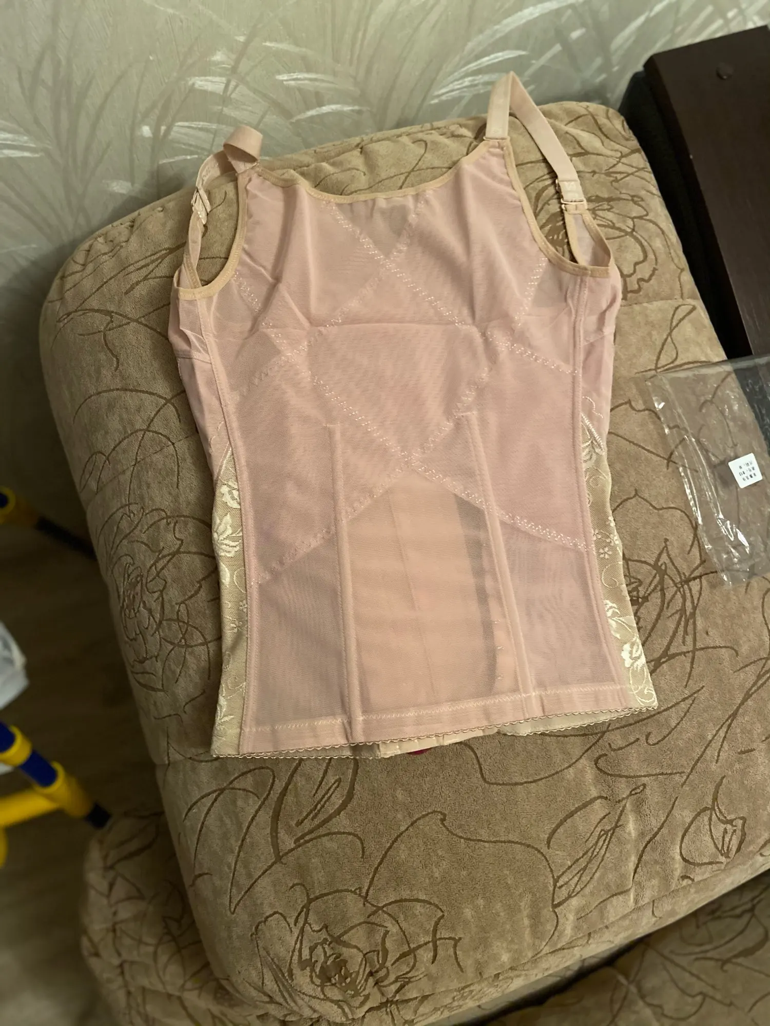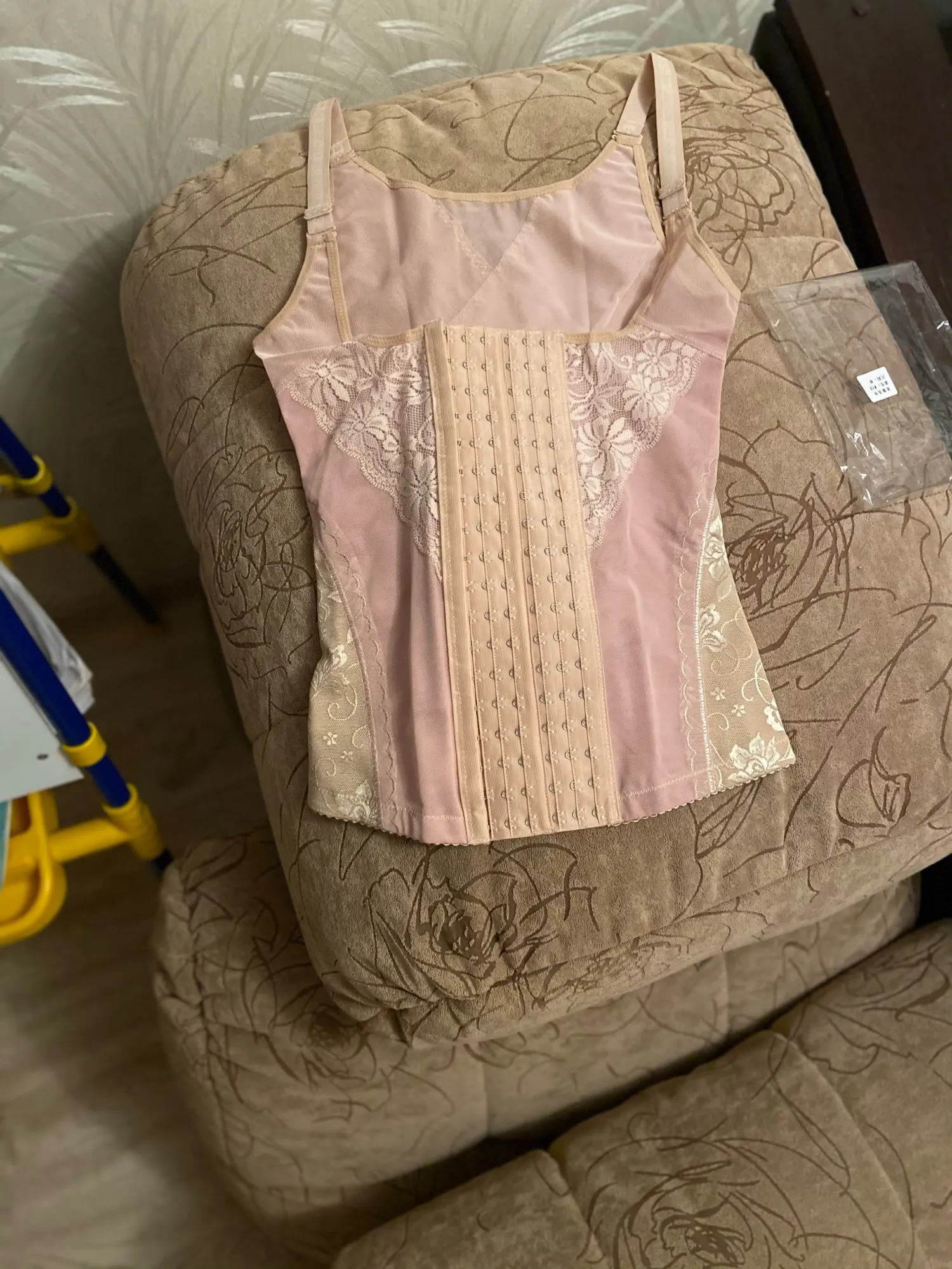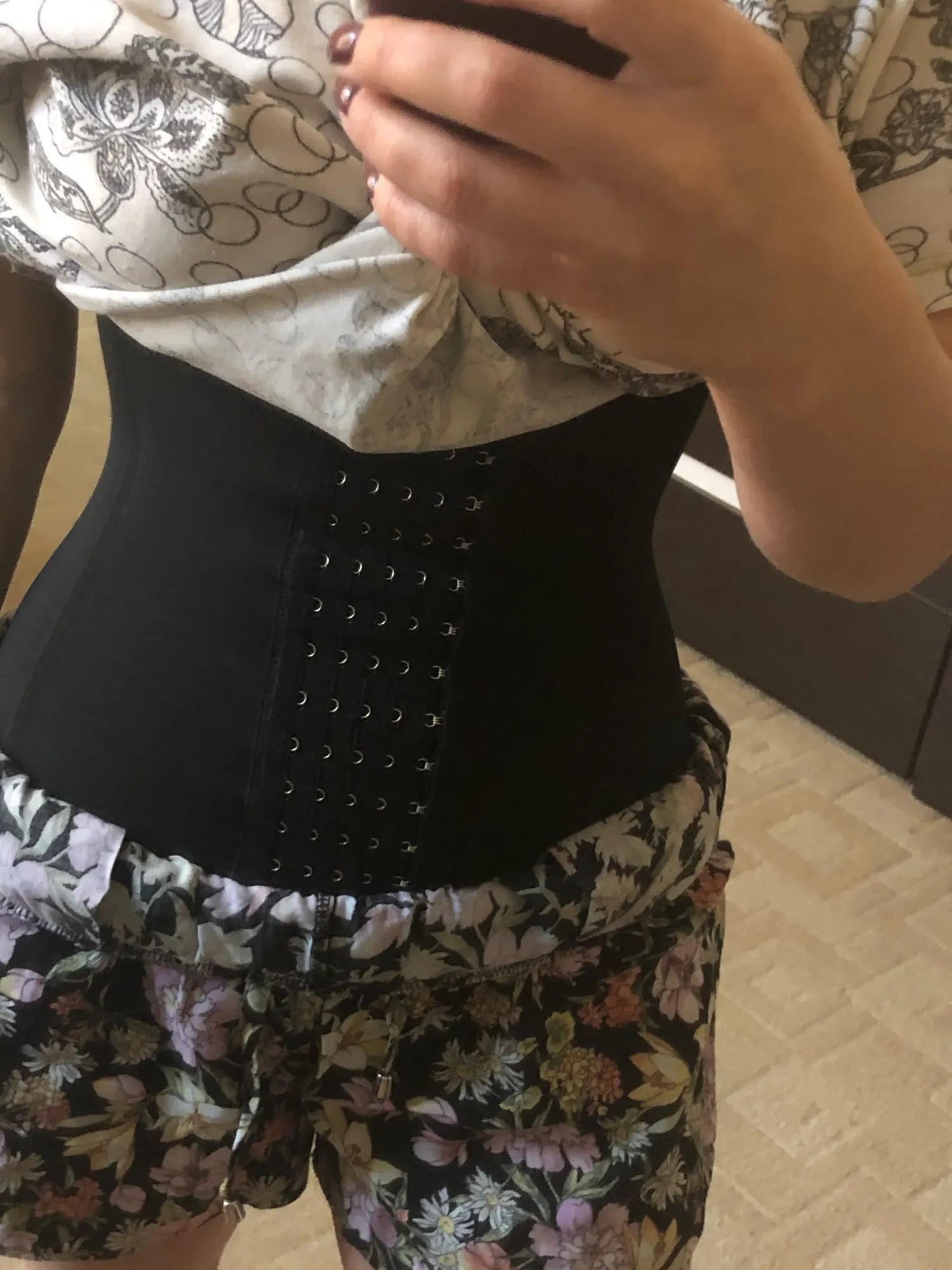 У меня никогда не было корсета. Пока я в восторге от эффекта! Действительно утянул мой живот. Облегающие трикотажные платья с ним смотрятся совершенно по-другому. Подчернутая талия и практически не видно живота. Единственный минус-ребра жёсткости упираются в грудь, когда сидишь. Сзади хорошо поддерживает спину. Для моей фигуры размер подошёл практически идеально. Сзади ничего не торчит. Моя талия 73 см, бедра 93 см, рост 167 см, вес 56 кг. Размер меньше не советую. На фото застегнуто на 2 ряд крючков, можно попытаться на 3, но думаю, это излишне. На 1 ряд тоже норм. Не ожидала, что так понравится вещь! Сшито очень качественно. Единственное, к крючкам надо приноровиться. Доехал корсет очень быстро. Продавца очень рекомендую! Спасибо!!!