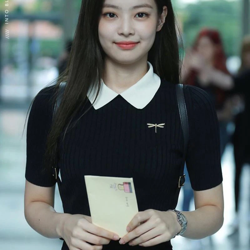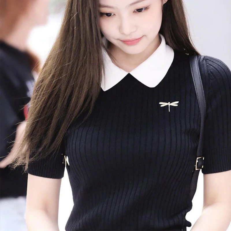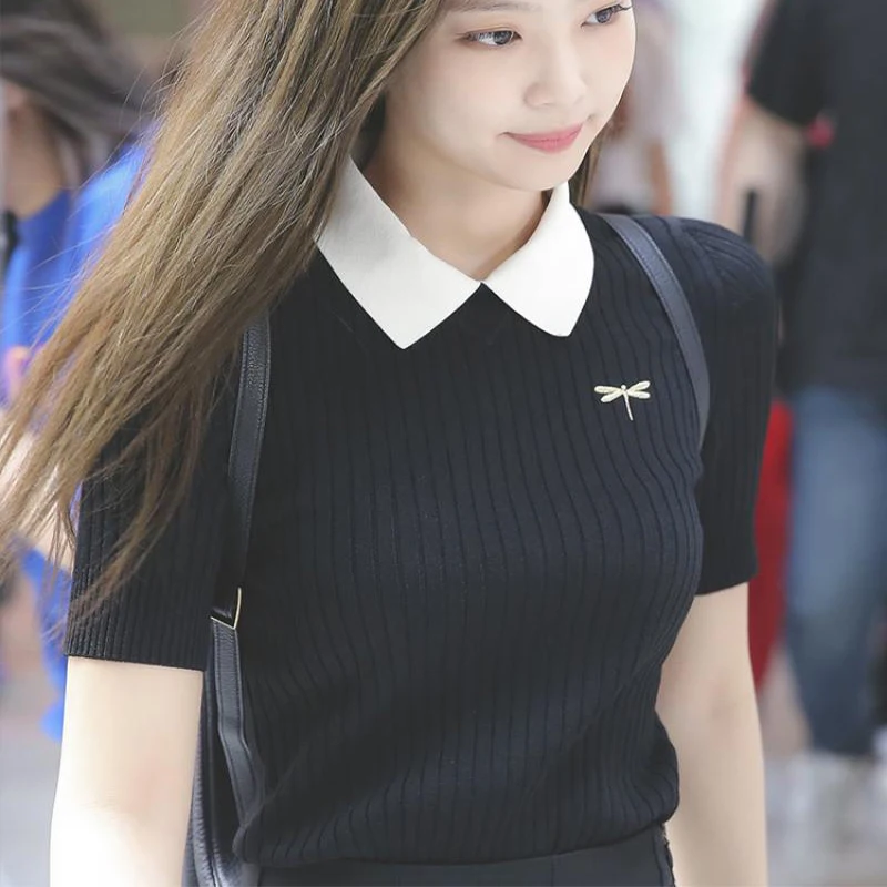 2020 летняя дизайнерская Новая Женская одежда Тонкий Топ черный вязаный короткий рукав Стрекоза Вышивка Белый отворот Повседневная футболка