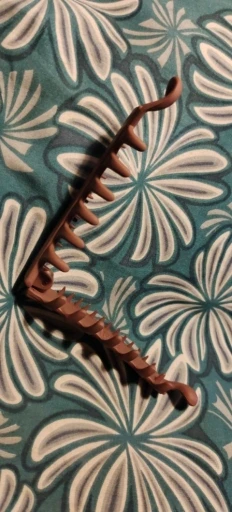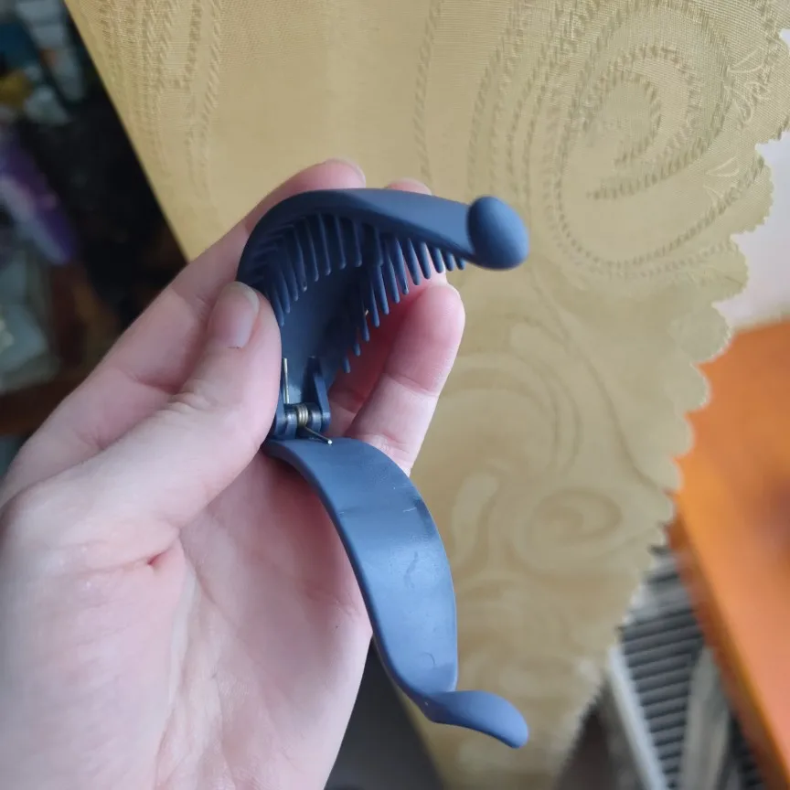 Неплохая заколка-краб. Есть небольшие непрокрасы внутри и заусенки, но все некритичные. Держит хорошо.